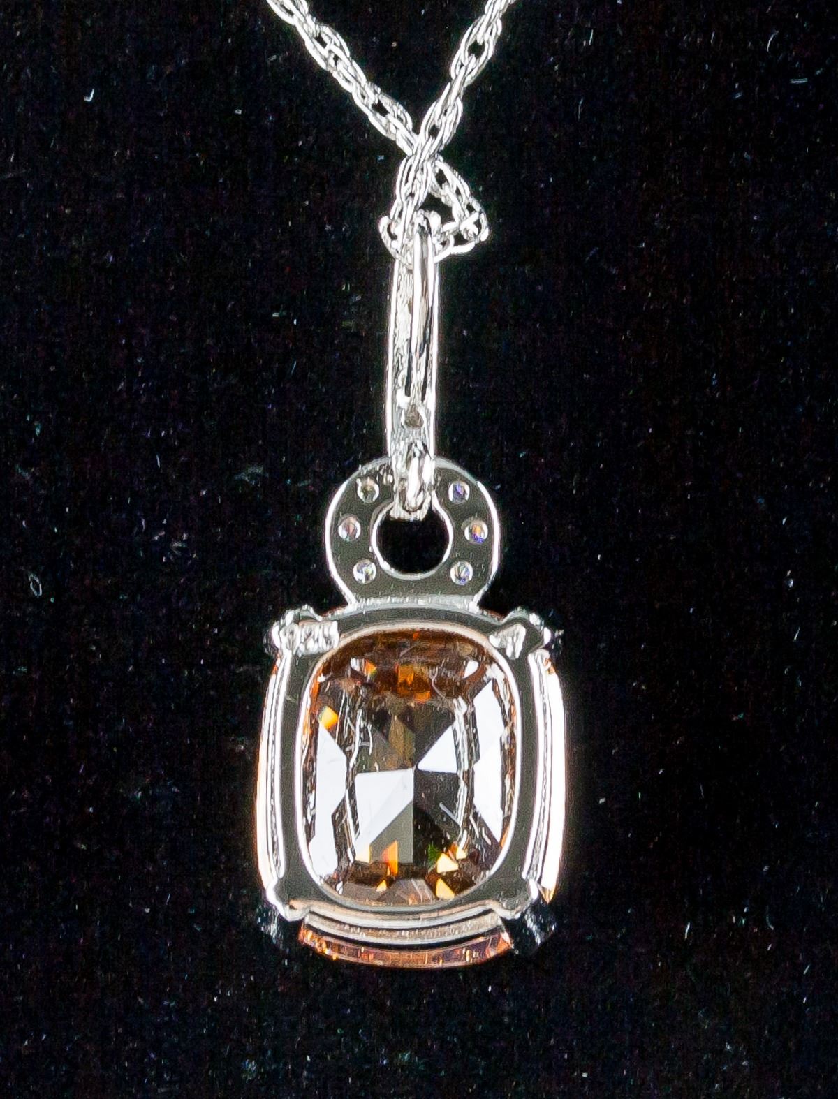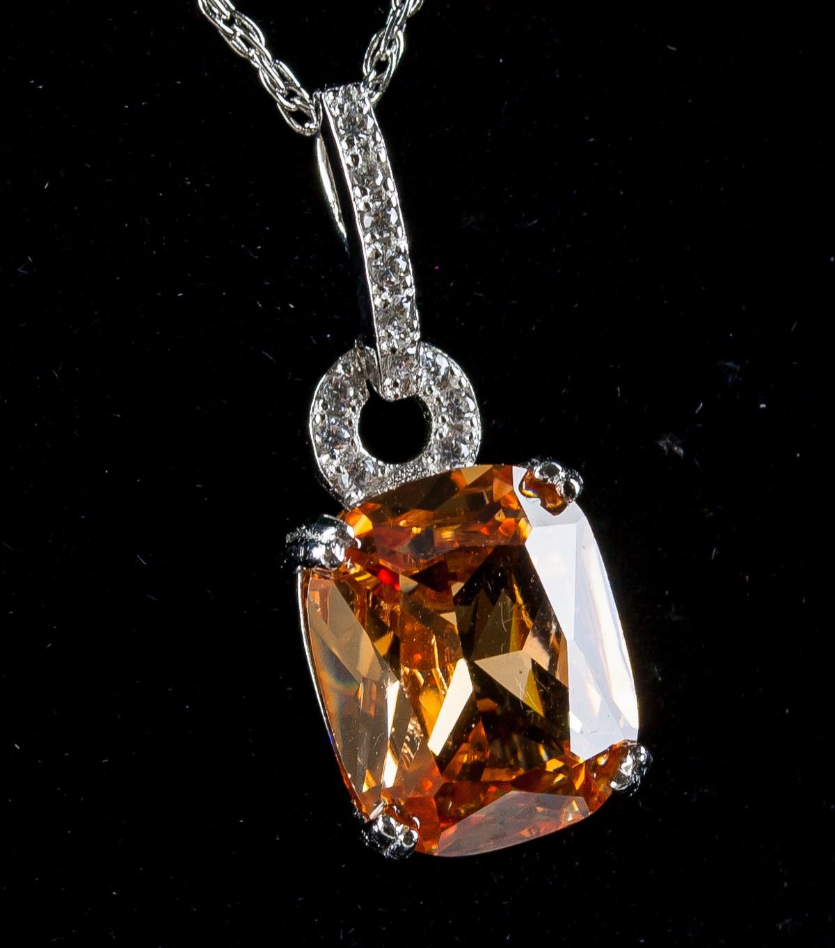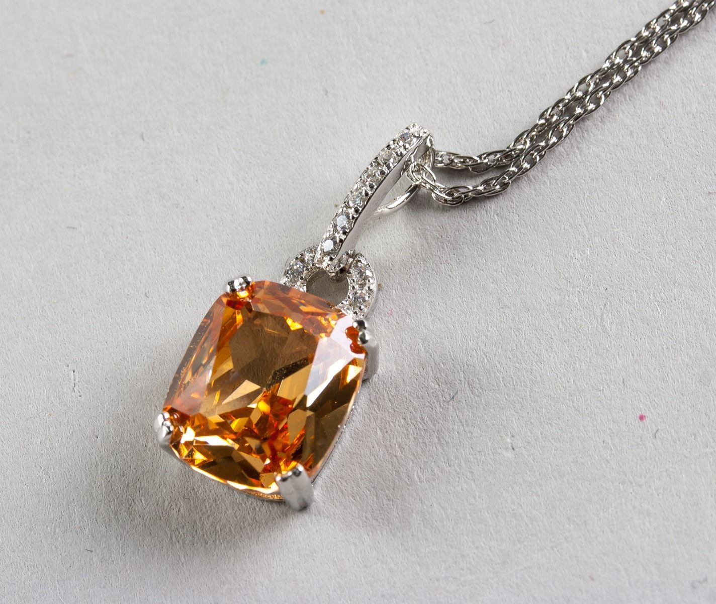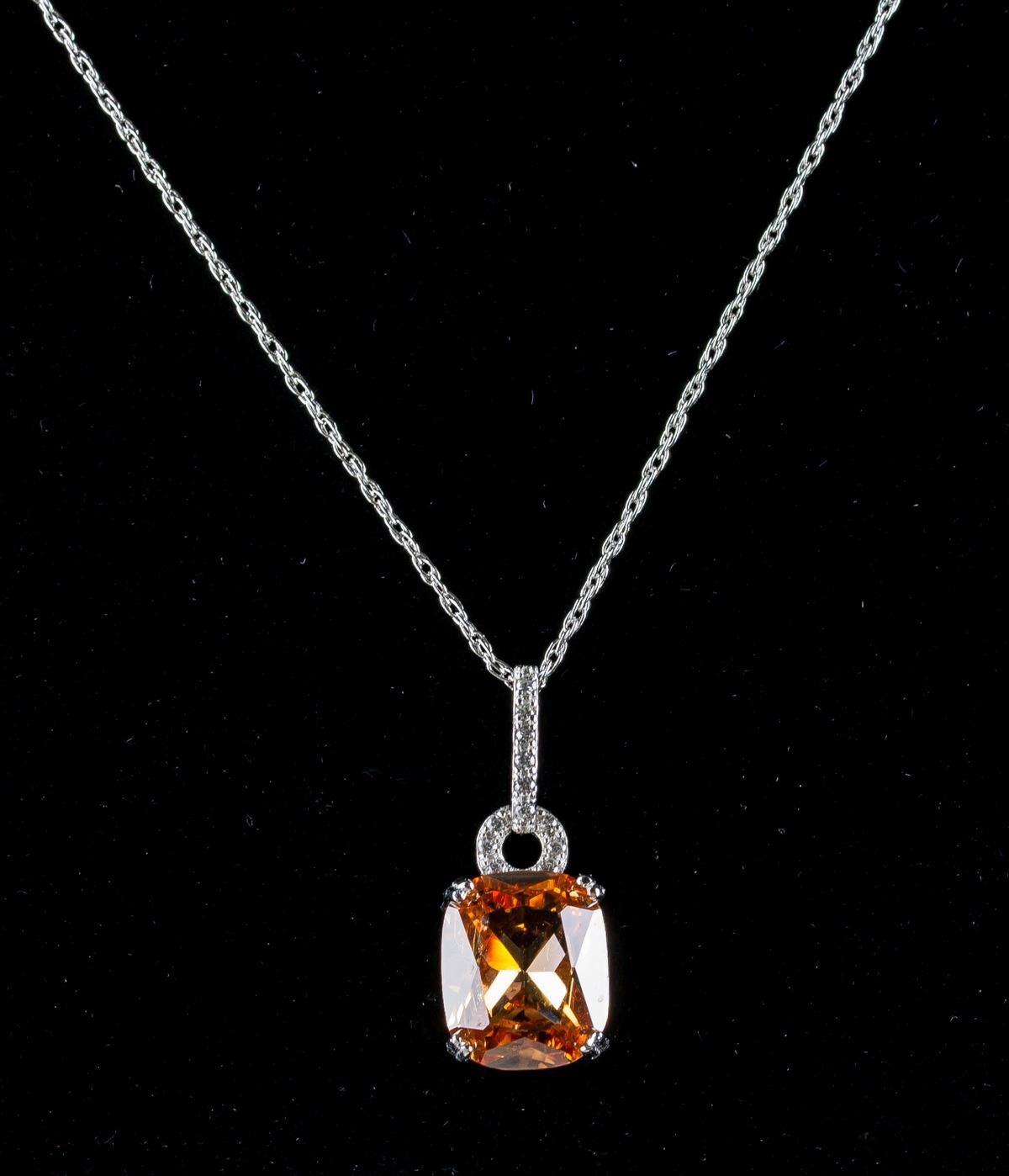 Stamped 925 silver necklace with pendant. Set with one orange colored, cushion cut morganite.