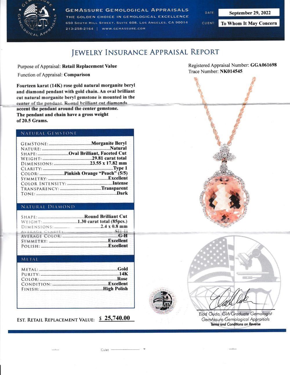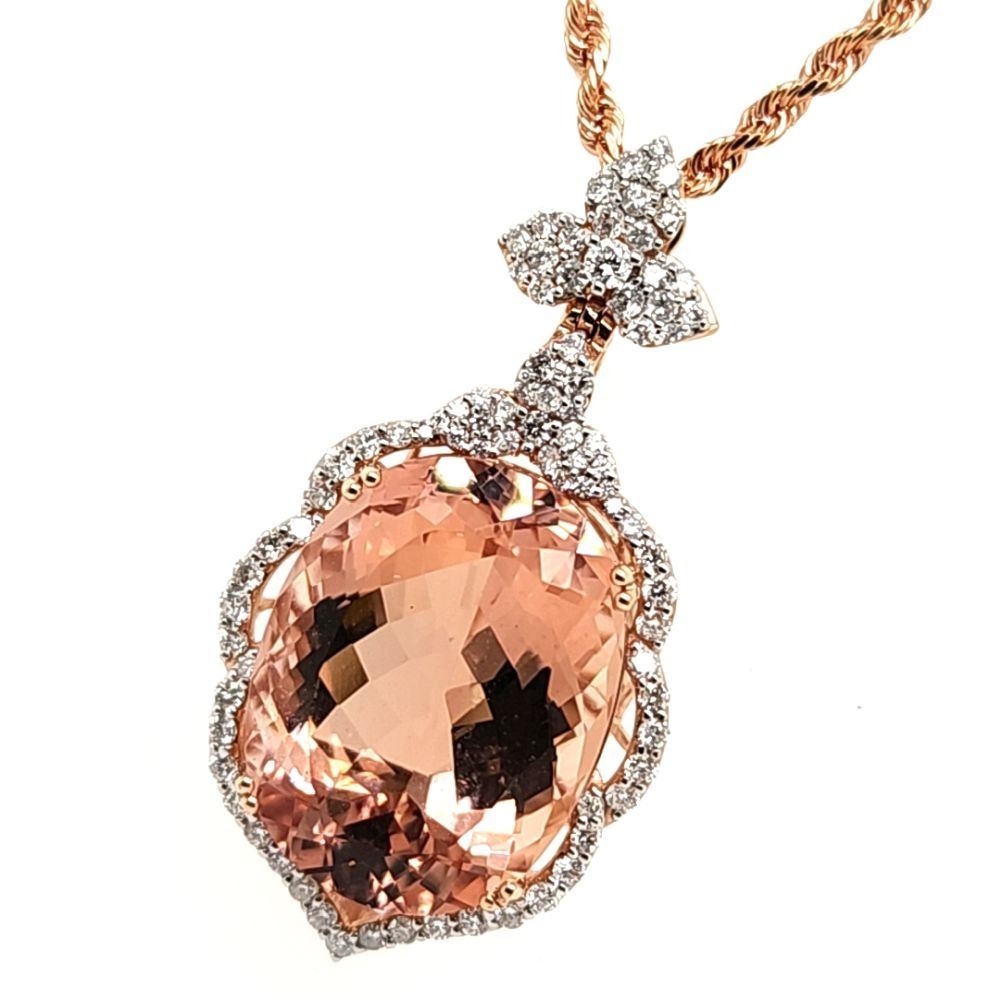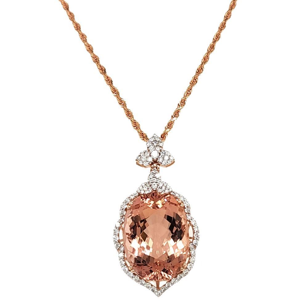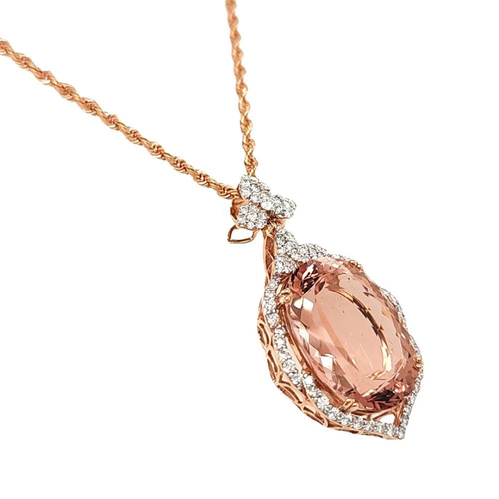 ADDITIONAL INFORMATION:& nbsp; The marvelous oval-cut Morganite is double-prong set in a rose gold pendant with brilliant-cut diamonds in the sweeping halo and flower petal bail. The Morganite is held in a basket setting with a beautifully curved side gallery and the back gallery that serves for support and stability bears the Oscar Friedman hallmark. The bail can accommodate a chain up to approximately 3.5 mm thick.