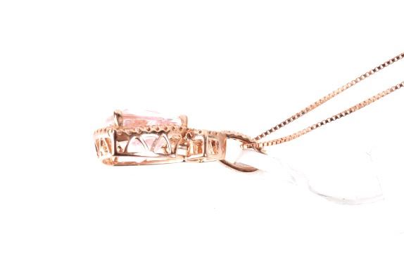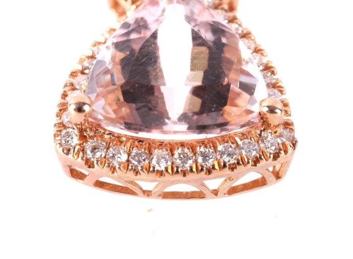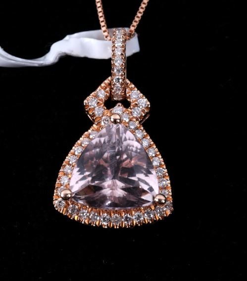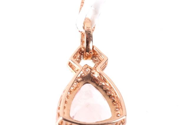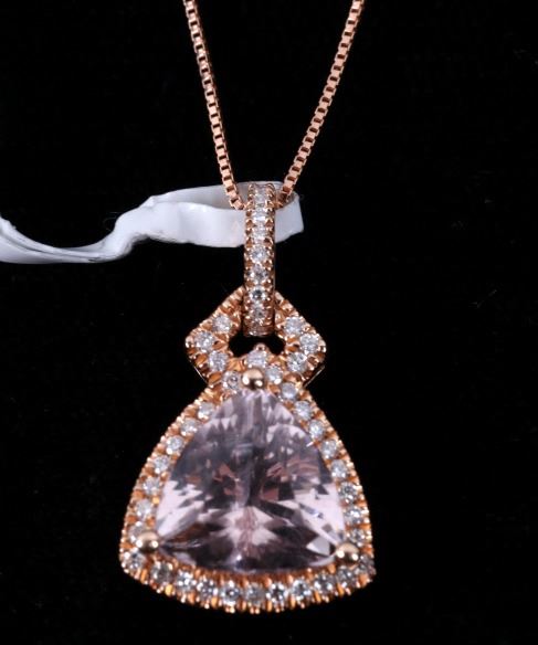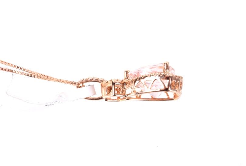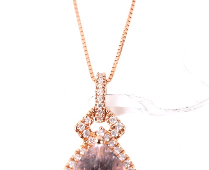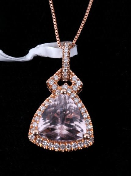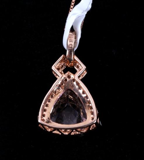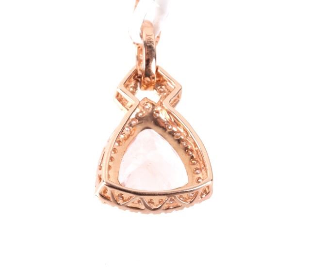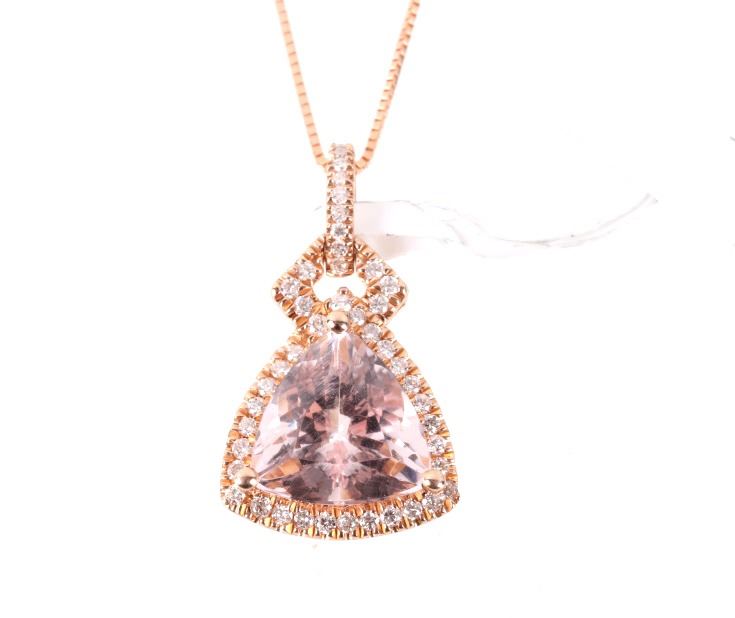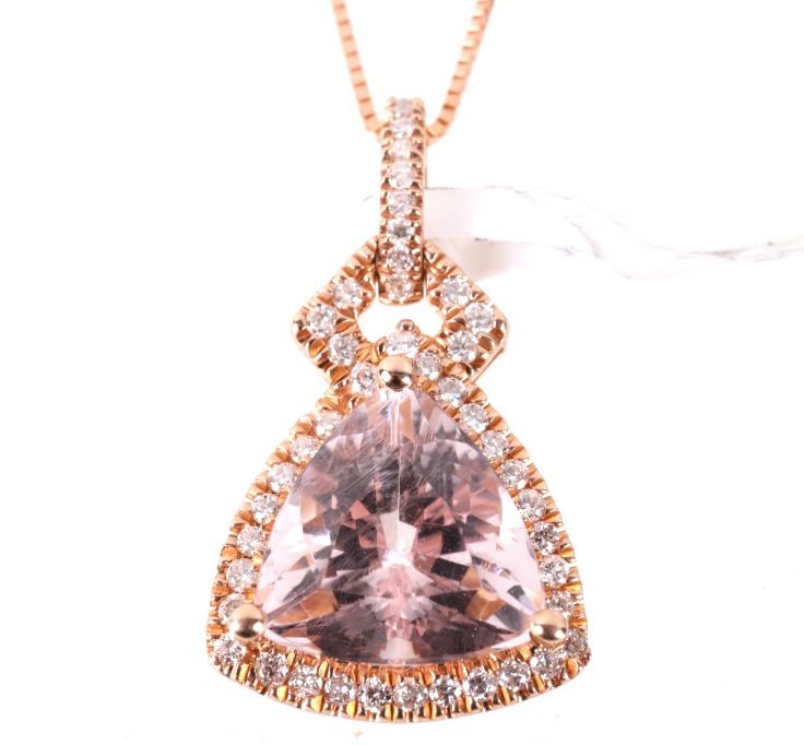 The lot features a 14K rose gold pendant necklace set with Morganite and Diamonds. The piece shows a trillium cut natural Morganite stone with nice peach pink coloring and eye clean transparent clarity being prong set in a soft Rose Gold 14K pendant which is further adorned with 44 round brilliant natural Diamonds having a weight of 0.22 carats. The Morganite shows a size of 2.15 carats. The piece is on a chain link necklace which shows an 18 inch length. The necklace has a gold weight of 1.42 grams. The pendant is strung on an 18 karat rose gold chain.