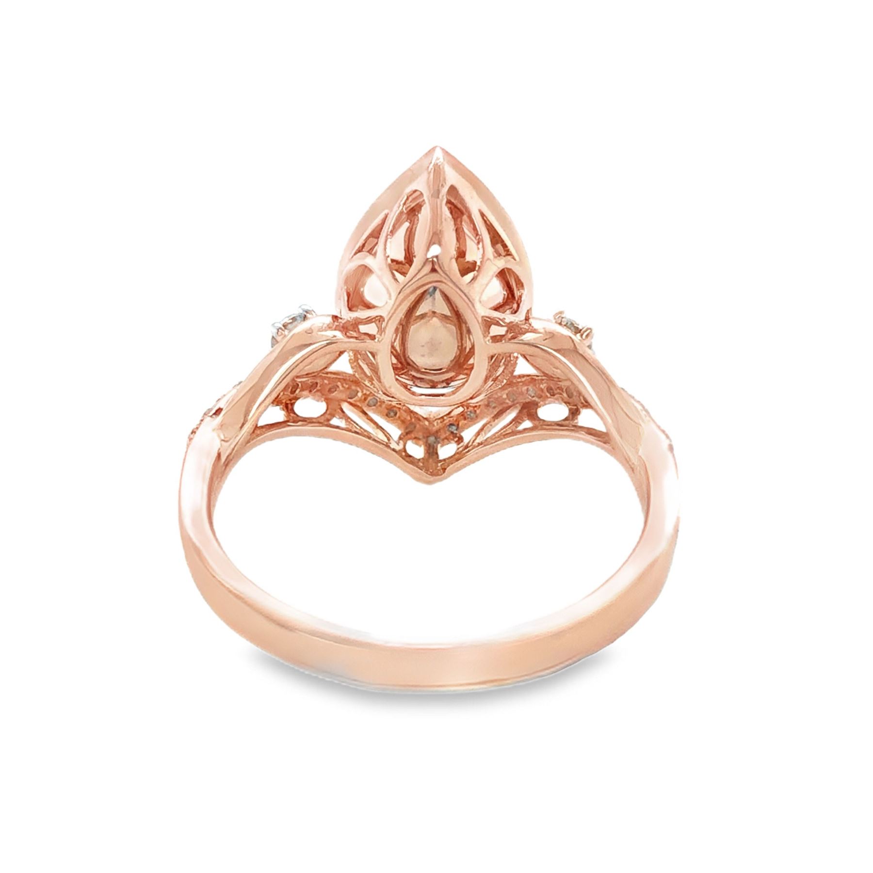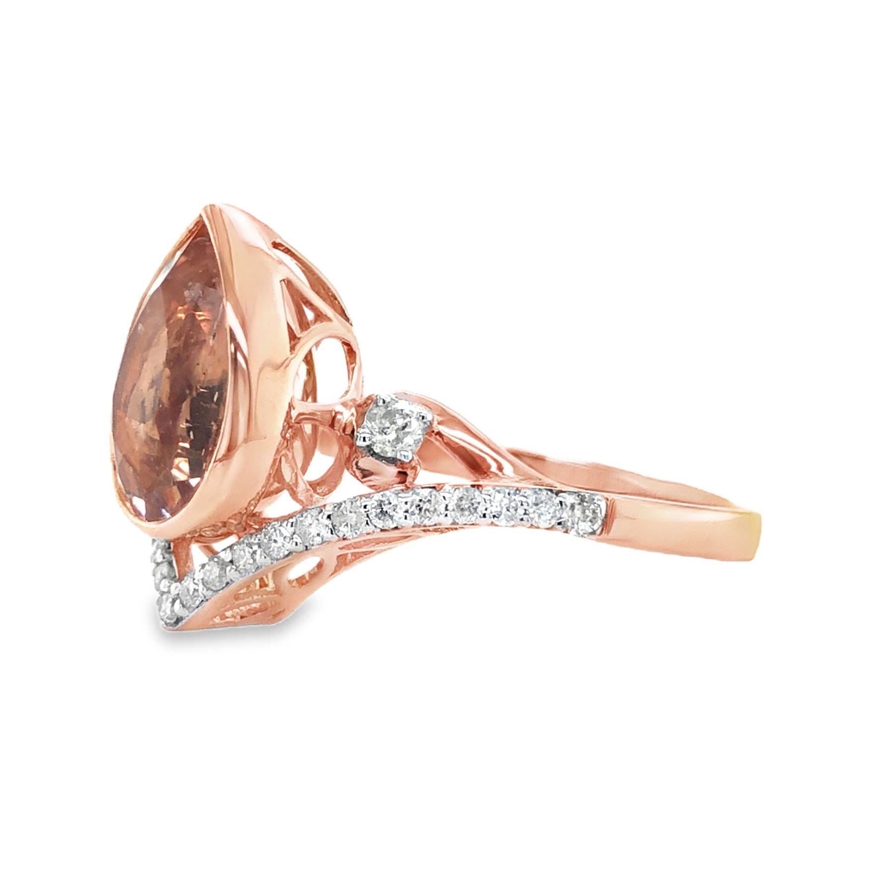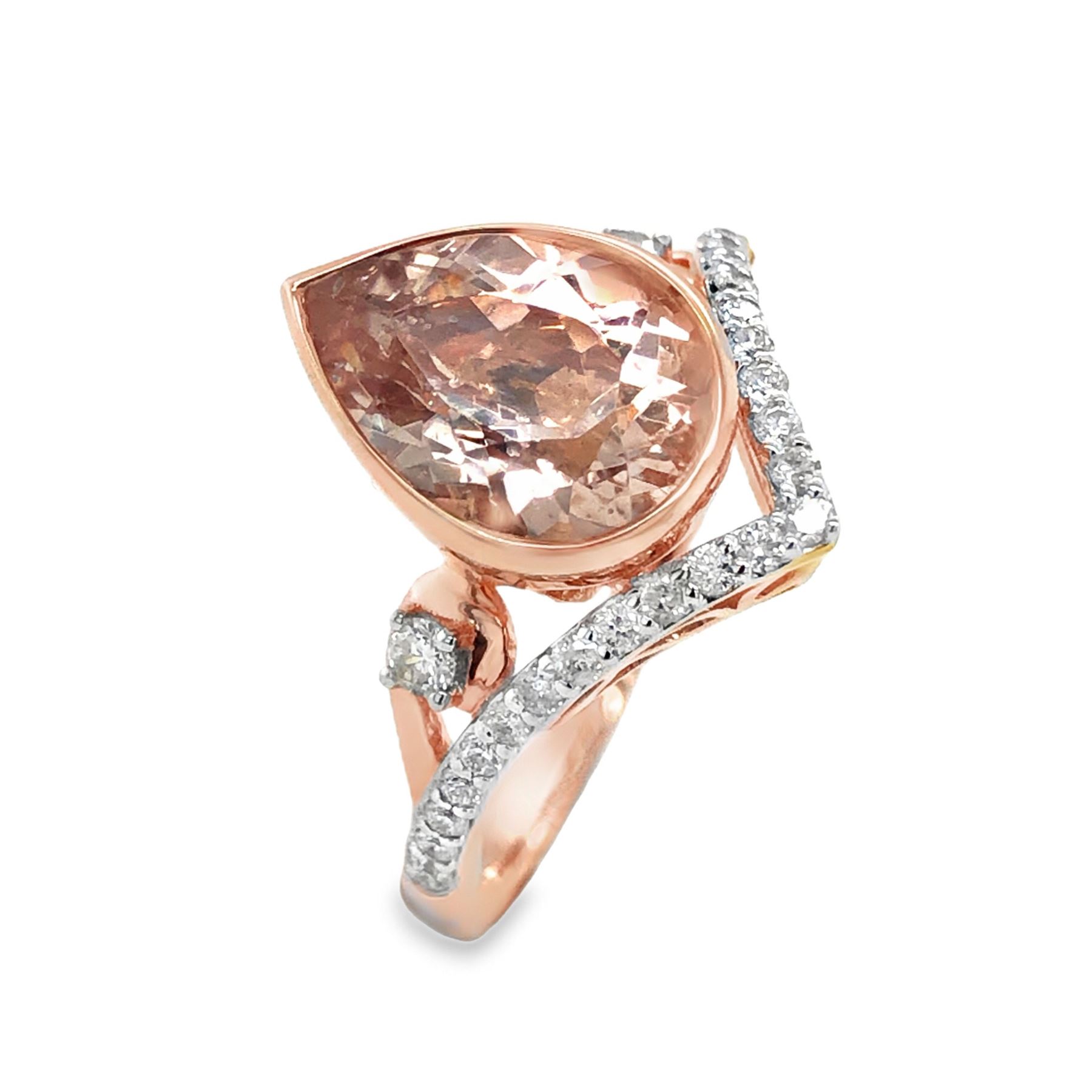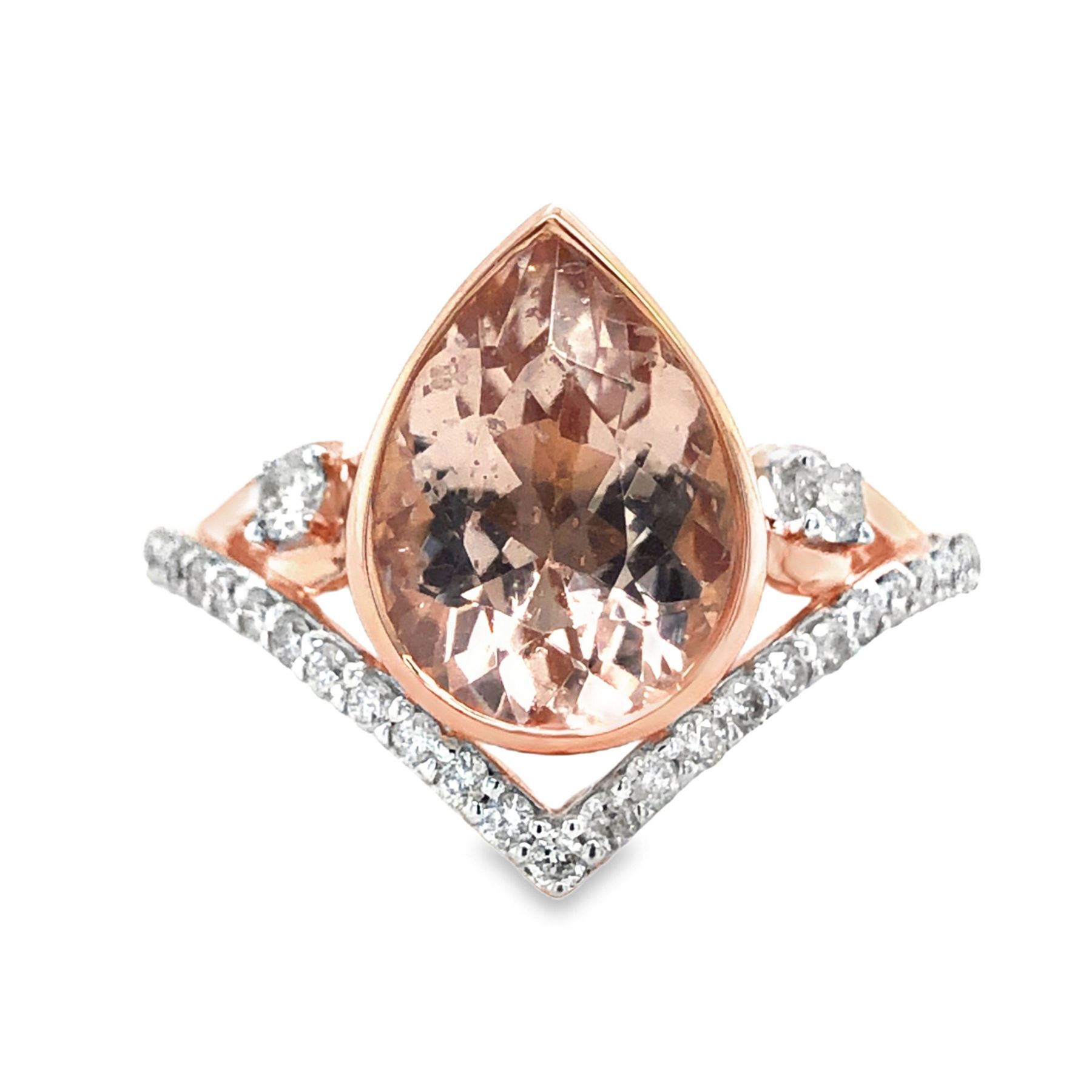 DESCRIPTION DETAIL: A beautiful Morganite set in a rose gold modern chevron shaped mounting with diamonds along the chevron and accents on either side.& nbsp;
