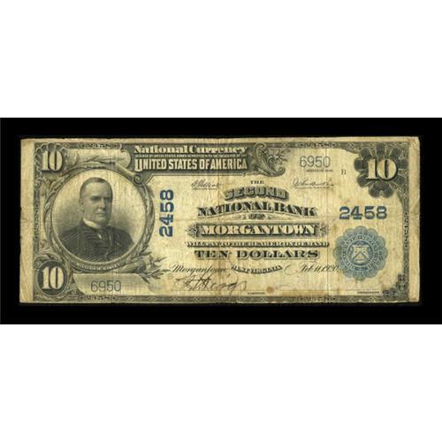 <B>Morgantown, WV</B></I> - $10 1902 Plain Back Fr. 633 <B>The Second NB</B></I> Ch. # 2458<BR> This original issue was last seen at public auction in 2001. Since that time, only two other notes from this bank made major auction appearances. A look at the census reveals that no issue from this bank grades better than Fine. While the eye appeal of this issue is Fine or better, we must grade it <B>Very Good-Fine. </B></I>A small split is noted on one of the folds, but does not negatively affect the eye appeal.<BR><BR><b>Shipping:</b> Coins & Currency (<a target="_blank" href="http://www.heritageauctions.com/common/shipping.php">view shipping information</a>)