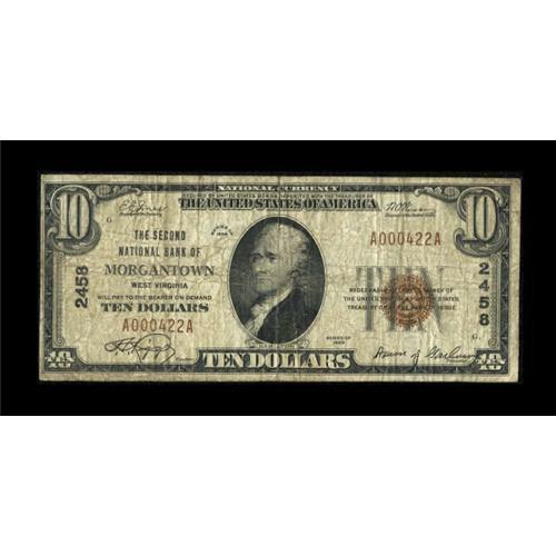 <B>Morgantown, WV</B></I> - $10 1929 Ty. 1 <B>The Second NB</B></I> Ch. # 2458<BR> The census lists only five Series 1929 notes and that does not include this recent discovery. There has also been only one small size note appearance at a traditional auction house and that was by us in May 2002. <B>Very Good</B></I>.<BR><BR><b>Shipping:</b> Coins & Currency (<a target="_blank" href="http://www.heritageauctions.com/common/shipping.php">view shipping information</a>)