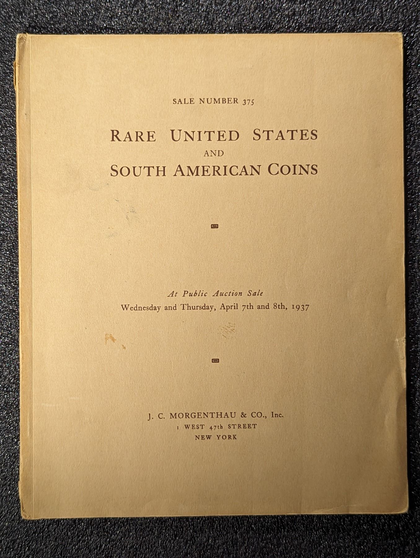 Morgenthau, J.C. & Co., Inc. RARE UNITED STATES AND SOUTH AMERICAN COINS. April 7-8, 1937. 4to. 1-980 Lots. Original printed card covers. Public Auction Sale. New York. 45 pages. 8 b&w coin plates. Writing on back cover. Near Fine. Ancients, choice Spanish American and Mexican gold, United States copper, silver, and gold coins and currency. Lot weight: 0 lbs 7oz. Subject(s): Ancient, Spanish American, Mexican, United States Coinage, Paper Money.