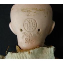 8" Japanese MB Morimura Bros bisque head doll, has composition body & missing left arm glass eyes, rocker needs repair, original pate for wig. Has 2 teeth ca 1920