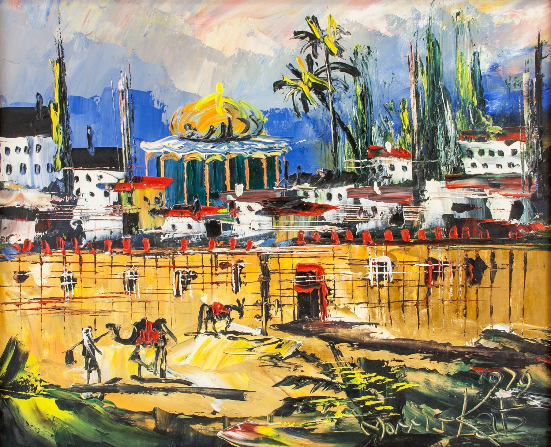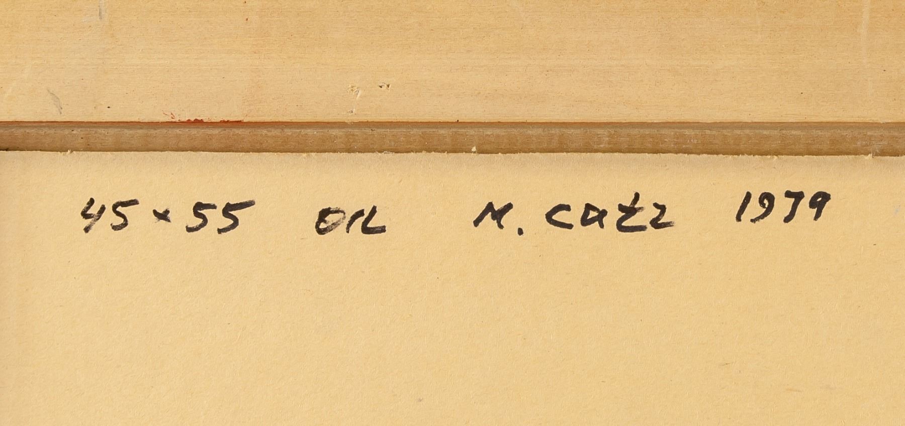 Oil on board. Signed and attr. Moris Catz (Polish-American, 1932-2010) on lower right corner. Verso marked upper left corner "45 x 55 Oil, M. Katz, dated 1979". Tagged from Waddingtons's sale in 2016, lot 150. 17 x 22 inch (43 x 58 cm). Catz described his method as "Instant Art," as he completed entire paintings in as little as 30 seconds. In a 1987 event to benefit the Boy Scouts of America, Catz completed 103 paintings (selling 55 of them on the spot) in 12 hours. He is listed as a human oddity in Ripley's Believe It Or Not because of his ability to paint full works of art in less than five minutes. A 2003 review of a serious painting said "Normally this artist's works are notable only for their carefree and speedy execution, but this painting is a welcome exception."