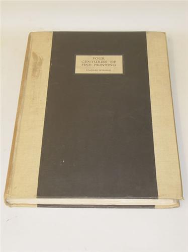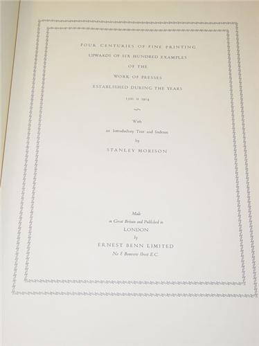 Morison, Stanley [with Introductory Text & Indexes by]. Four Centuries of Fine Printing Upwards of Six Hundred Examples of the Work of Presses Established During the Years 1500 to 1914 . London: Ernest Benn Limited, 1924. First Edition. Elephant Folio - over 15" - 23" tall. Hard Cover. Ex-Library. Very Good Condition. LIMITED EDITION #126/390 - Regular Edition in English. xxix, 243pp with 625 plates. In original cloth binding, with binding & hinges tight. Some soiling to covers.