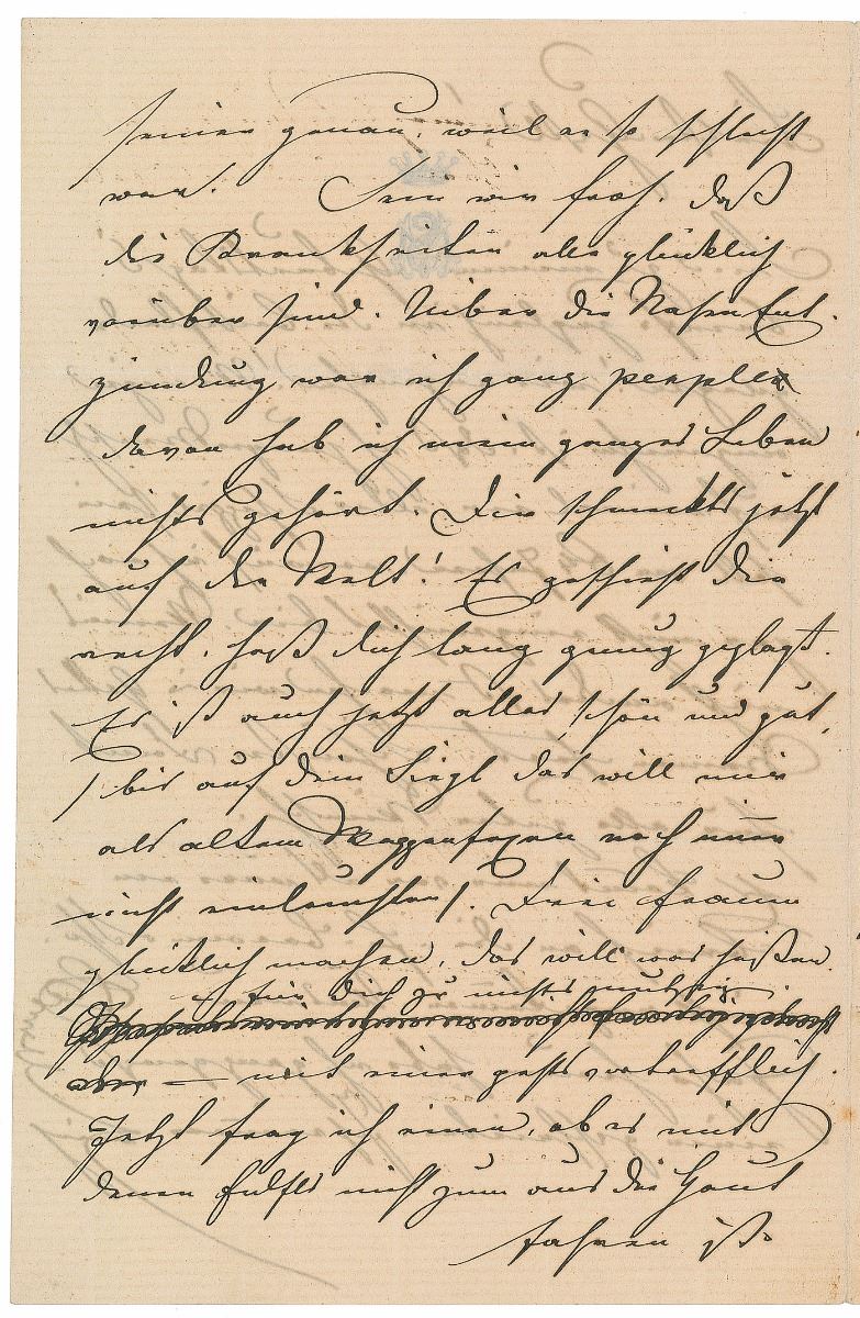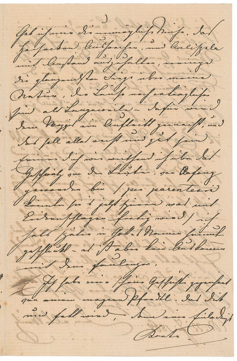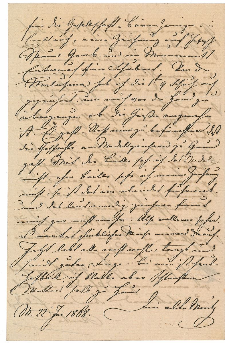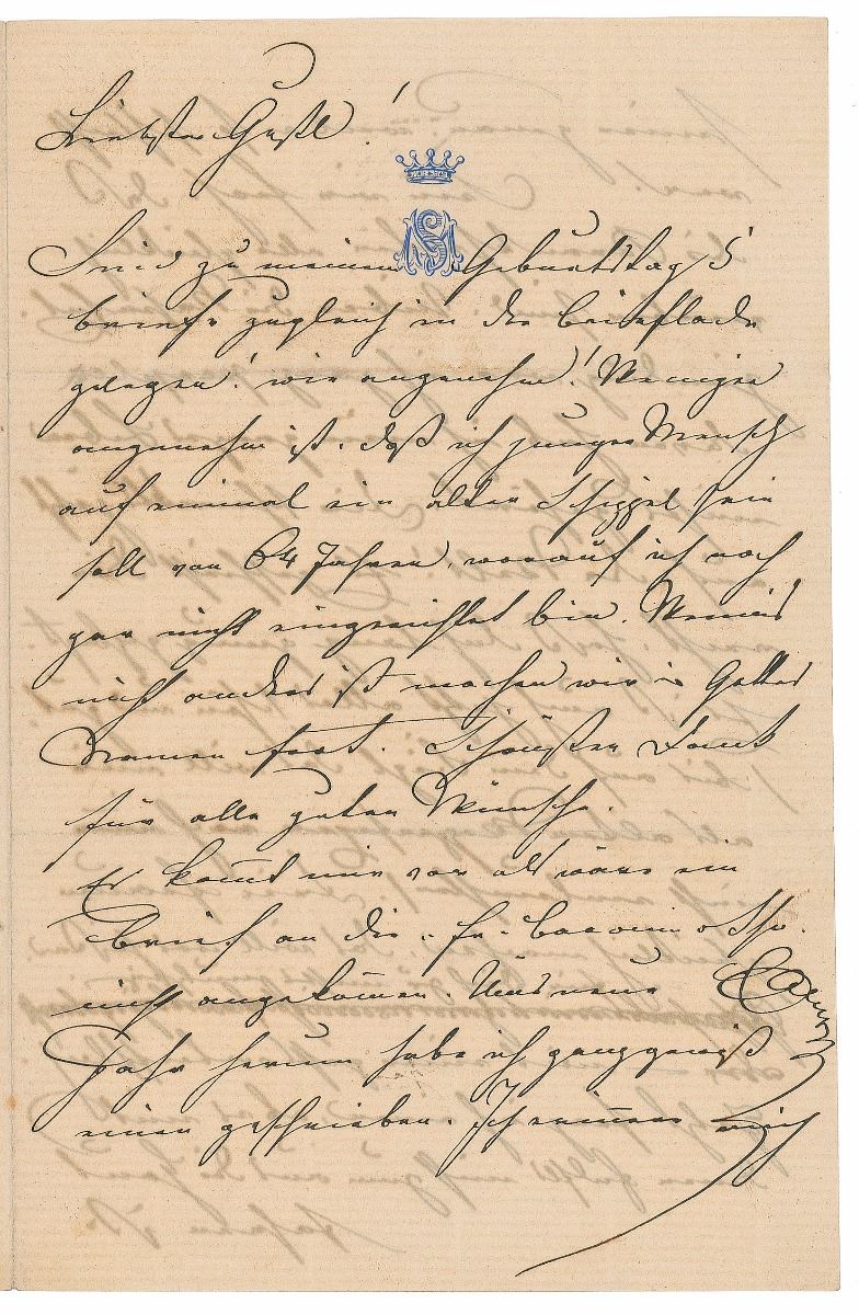 Austrian painter (1804–1871) who drew inspiration from chivalry, folklore, and the songs of the people. ALS in German, signed “Moritz,” four pages on two adjoining sheets, 5.5 x 8.5, personal monogrammed letterhead, June 22, 1868. Lengthy letter to his brother August on the occasion of his 64th birthday. Schwind quips about his age, describes some themes of his recent drawings (including the story of a fat horse), and complains about his eyes, writing (translated), "With the glasses, I can't see the sitter, and without the glasses I can not see my drawing.” In fine condition, with show-through from writing to opposing sides.