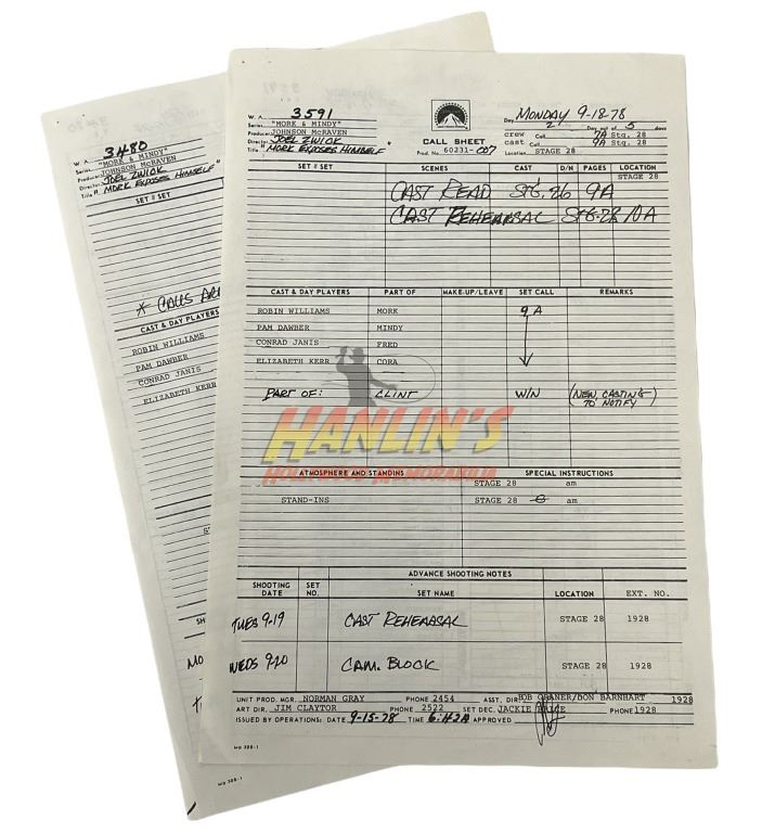 Mork & Mindy (1978 - 1982) - Set of 2 Production Used Call-Sheets.