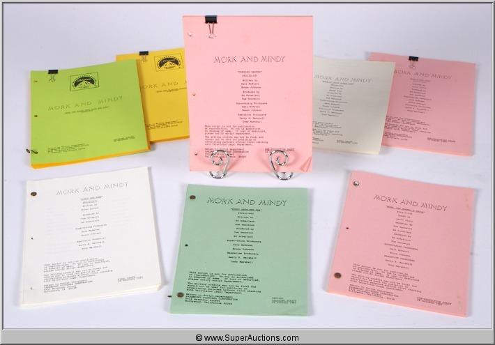"Mork & Mindy" Scripts/ Paramount Studios Productions ~ "Dueling Skates" / #60233-054 / Pre-Production Draft / August 14, 1980 ~ " Mork's New Look" / #60233-1053 / Pre-Production / August 25, 1980 ~ "Mork In Never Never Land" / #60233-052 / Final Draft / October 20, 1980 ~ "Mork, the Monkey's Uncle" / #60233-055 / Pre-Production Draft / October 28, 1980 ~ "Mindy Gets Her Job" / #60233-1062 / Revised Shooting Sctipt / January 09, 1981 ~ "Twelve Angry Applicances" / #60233-063 / Final Draft / January 13, 1981 ~ "There's A New Mork In town" / #60233-1058 / Final Draft / January 20, 1981 ~ "Mork Meets Robin Williams" / #60233-066 / Final Draft / January 27, 1981 ~ "Mindy, Mindy, Mindy" / #60233-067 / Final Draft / February 10, 1981 ~ "Mork The Swinging Single" / #60233-1068/ / Shooting Script / February 19, 1981 ~ "Mindy And Mork" / #60233-073 / Final Draft / February 24, 1981 ~ "Mork And Mindy Meet Rick And Ruby" / #60233-070 / Shooting Script / February 26, 1981 ~ "Old Muggable Mork" / #60233-069 / Final Draft / March 10, 1981