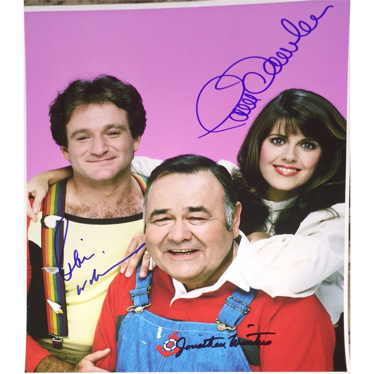 A matte finish incredible 11x14 image of the cast of the groundbreaking show signed by ROBIN WILLIAMS, PAM DAWBER and JONATHAN WINTERS as their child