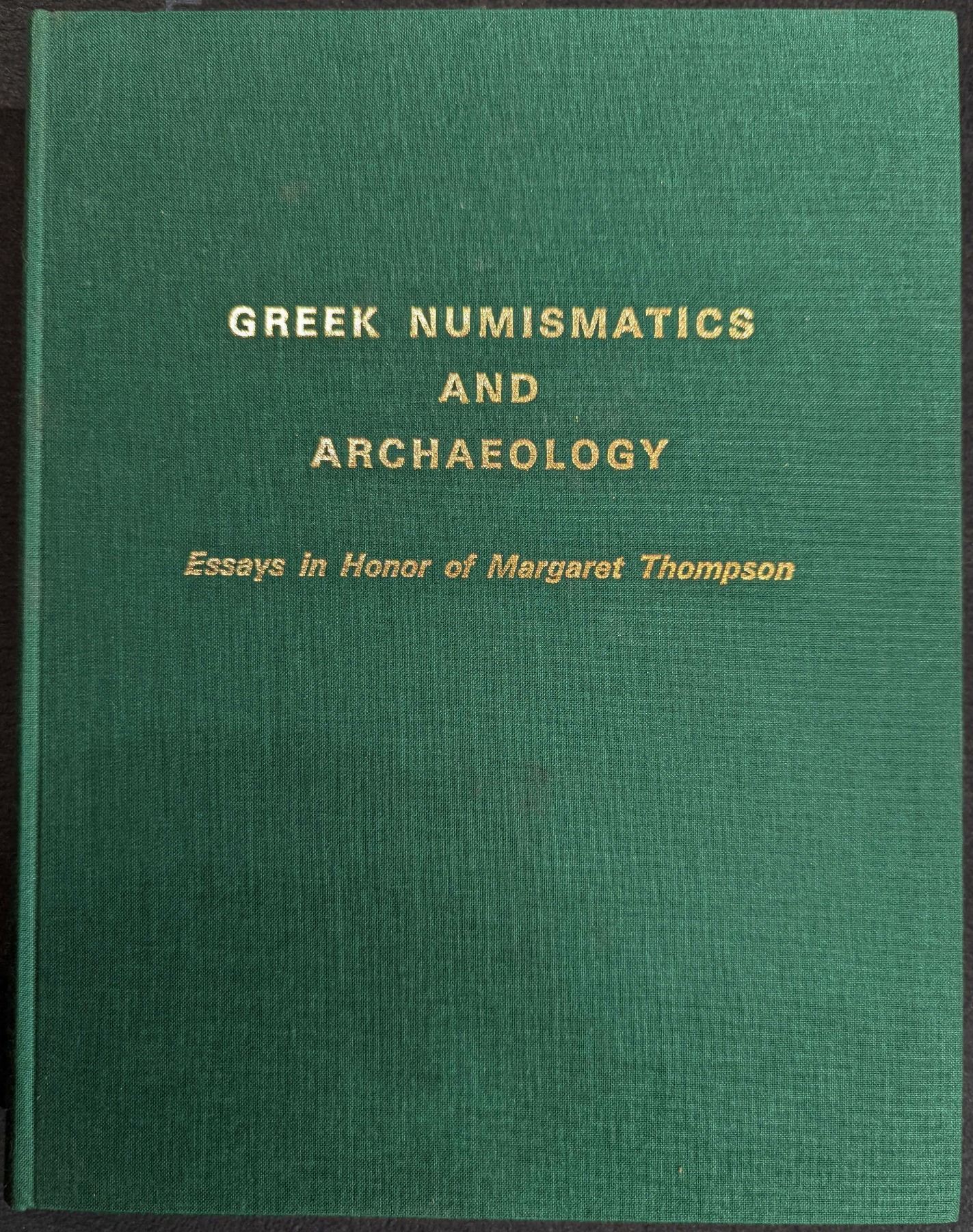 Morkholm, Otto & Nancy M. Waggoner (Eds.). GREEK NUMISMATICS AND ARCHAEOLOGY. ESSAYS IN HONOR OF MARGARET THOMPSON. Cultura Press. 1979. 4to. xix, (1), 326, (2) pages. Wetteren. original green cloth, gilt. Frontispiece. text figures. 41 plates. Fine. This book is a collection of 30 very relevant articles (most of them in English) by prominent numismatists specializing in the Greek series such as H. Bloesch, C. Boehringer, H.A. Cahn, W.E. Metcalf, G. Le Rider, and many more. Among the more useful and important articles included here are 'The Late Cistophori of Apamaea' (F.S. Kleiner), 'The Portrait Coinage of Ptolemy V' (O. Morkholm), 'Winged Carians' (H.A. Troxell), 'Der Tissaphernes-Fund' (S. Hurter), and 'Tetradrachms From Babylon' (N.M. Waggoner). Table of Contents:- Cahn, Herbert A. 'Olynthus' and Syracuse.- Boehringer, Christof - Zu Finanzpolitik und Munzpragung des Dionysios von Syrakus.- Hackens, Tony - A propos de la couronne fleurie de la deesse Hera.- Buttrey, T. V. - The Athenian currency law of 375/4 B.C.- Jones, Frances Follin - Fifteen turtles and tortoises.- Holloway, R. Ross - The bronze coinage of Agathocles- Harrison, Evelyn B. - The iconography of the eponymous heroes on the Parthenon and in the Agora.- Hurter, Silvia - Der Tissaphernes-Fund.- Jenkins, G. Kenneth. - A Tarentine footnote.- Meshorer, Yaakov. - Sepphoris and Rome.- Nicolet-Pierre , Helene - Les monnaies des deux derniers satrapes d'Egypte avant la conquete d'Alexandre.- Kleiner, Fred S. - The late Cistophori of Apameia.- Mildenberg, Leo. - Yehud : a preliminary study of the provincial coinage of Judea.- Le Rider, Georges. Un tetradrachme hellenistique de Cnide.- Metcalf, William E. - New and noteworthy from Roman Alexandria. Pescennius Niger-Diadumenian.- Price, Martin Jessop. - On attributing Alexanders - some cautionary tales.- Kraay, Colin M. - The Isparta hoard.- Mitrea, Bucur. - Un tetradrachme Athenien du nouveau style decouvert en Dacie.- Morkholm, Otto. - The portrait coinage of Ptolemy V : the main series.- Naster, Paul. - Empreintes de sceaux hellenistiques de Warka et monnaies seleucides.- Oeconomides, Mando Caramessini. - The 1970 Myrina hoard of Aeginetan staters.- Kroll, John H. A chronology of early Athenian bronze coinage, ca. 350-250 B.C.- Zervos, Orestes H. - Near Eastern elements in the tetradrachms of Alexander the Great : the eastern mints.- Thompson, Dorothy Burr. - A numismatic comentary on the Ptolemaic cult oinochoai.- Thompson, Margaret. - A bibliography of the works of Margaret Thompson.- Waggoner, Nancy M. - Tetradrachms from Babylon.- Troxell, Hyla A. - Winged Carians.- Weinberg, Gladys Davidson. On numismatic evidence.- Westermark, Ulla. Overstrikes of Taras on didrachms of Acragas. An important festschrift. Lot weight: 3 lbs 10oz. Subject(s): Ancient Coinage.