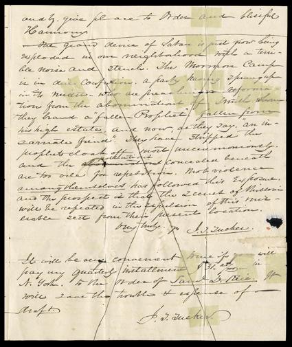 Autograph letter signed regarding Joseph Smith by Reverend J.T. Tucker of Hannibal, Missouri. Composed on 20 June 1844, just one week before Smith's murder, to Reverend M. Badger of the American Home Missionary Society in New York. In part, ''...the world, the flesh & the devil are driving on their projects of sin and ruin. One grand device of Satan is just now being exploded in our neighborhood with a terrible noise and stench. The Mormon camp is in dire confusion, a party having sprung up in its midst who are preaching a reformation from the abominations of Smith, whom they brand a 'fallen Prophet,' fallen from his high estate, and now, as they say, 'an incarnate fiend'. They have stripped the prophets cloak off most unceremoniously and the pollutions concealed beneath are too vile for repetition. Mob violence among themselves has followed this Exposure. And the prospect is that the scenes of Missouri will be repeated in the expulsion of this miserable sect from their present location...'' Tucker refers to the publication by dissident Mormon elders of the Nauvoo Expositor, revealing Smith's practice of polygamy, which was still an open secret. It also told of his questionable financial dealings, inquisitorial autocracy, and manipulation of the courts. Smith ordered his personal militia, the Nauvoo Legion, to destroy the newspaper's presses, and it was for this that a warrant was issued for his arrest. At first Smith fled to Iowa, but amid accusations of cowardice, he surrendered himself to the Illinois authorities and was jailed in nearby town of Carthage. From jail he issued the order for his militia to rescue him, and it is thought that when an anti-Mormon mob arrived to do him harm, he at first thought his followers had come to free him. The mob killed him and his brother Hyrum on 27 June 1844. Letter shows several ink spots, as some of the text (none of it regarding Smith) was used for the Missionary Society's publications. Minor splits repaired with transparent paper. Overall, very good.