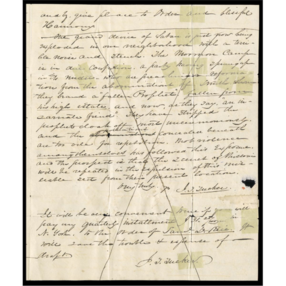 Autograph letter signed regarding Joseph Smith by Reverend J.T. Tucker of Hannibal, Missouri. Composed on 20 June 1844, just one week before Smith's murder, to Reverend M. Badger of the American Home Missionary Society in New York. In part, ''…the world, the flesh & the devil are driving on their projects of sin and ruin. One grand device of Satan is just now being exploded in our neighborhood with a terrible noise and stench. The Mormon camp is in dire confusion, a party having sprung up in its midst who are preaching a reformation from the abominations of Smith, whom they brand a 'fallen Prophet,' fallen from his high estate, and now, as they say, 'an incarnate fiend'. They have stripped the prophets cloak off most unceremoniously and the pollutions concealed beneath are too vile for repetition. Mob violence among themselves has followed this Exposure. And the prospect is that the scenes of Missouri will be repeated in the expulsion of this miserable sect from their present location…'' Tucker refers to the publication by dissident Mormon elders of the Nauvoo Expositor, revealing Smith's practice of polygamy, which was still an open secret. It also told of his questionable financial dealings, inquisitorial autocracy, and manipulation of the courts. Letter shows several ink spots, as some of the text (none of it regarding Smith) was used for the Missionary Society's publications. Minor splits repaired with transparent paper. Overall, very good.