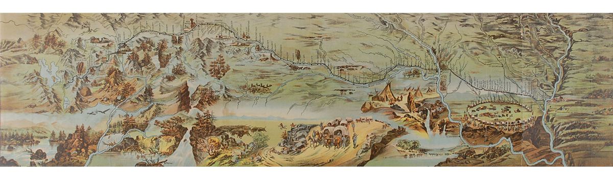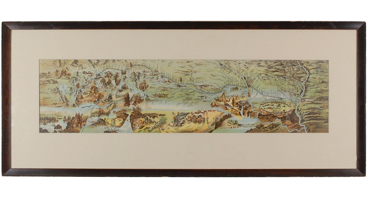 Striking color 28 x 7 chromolithographic print published in 1899 by Millroy & Hayes and issued by the Wilson Hotel, Salt Lake City, depicting the overland route taken by the Mormon pioneers during their trek from Nauvoo to Great Salt Lake during 1846 and 1847. Illustrated based upon Orson Pratt's record of the trip, the map charts the daily progress of the Mormons and features wonderful views of the wagon train, a group of tepees, a buffalo herd, and numerous other scenes from the journey. Matted and framed to an overall size of 35 x 15. In very good to fine condition, with a noticeable vertical crease on the left side. Pratt was a leader in the Latter Day Saint movement and an original member of the Quorum of Twelve Apostles. Oversized.