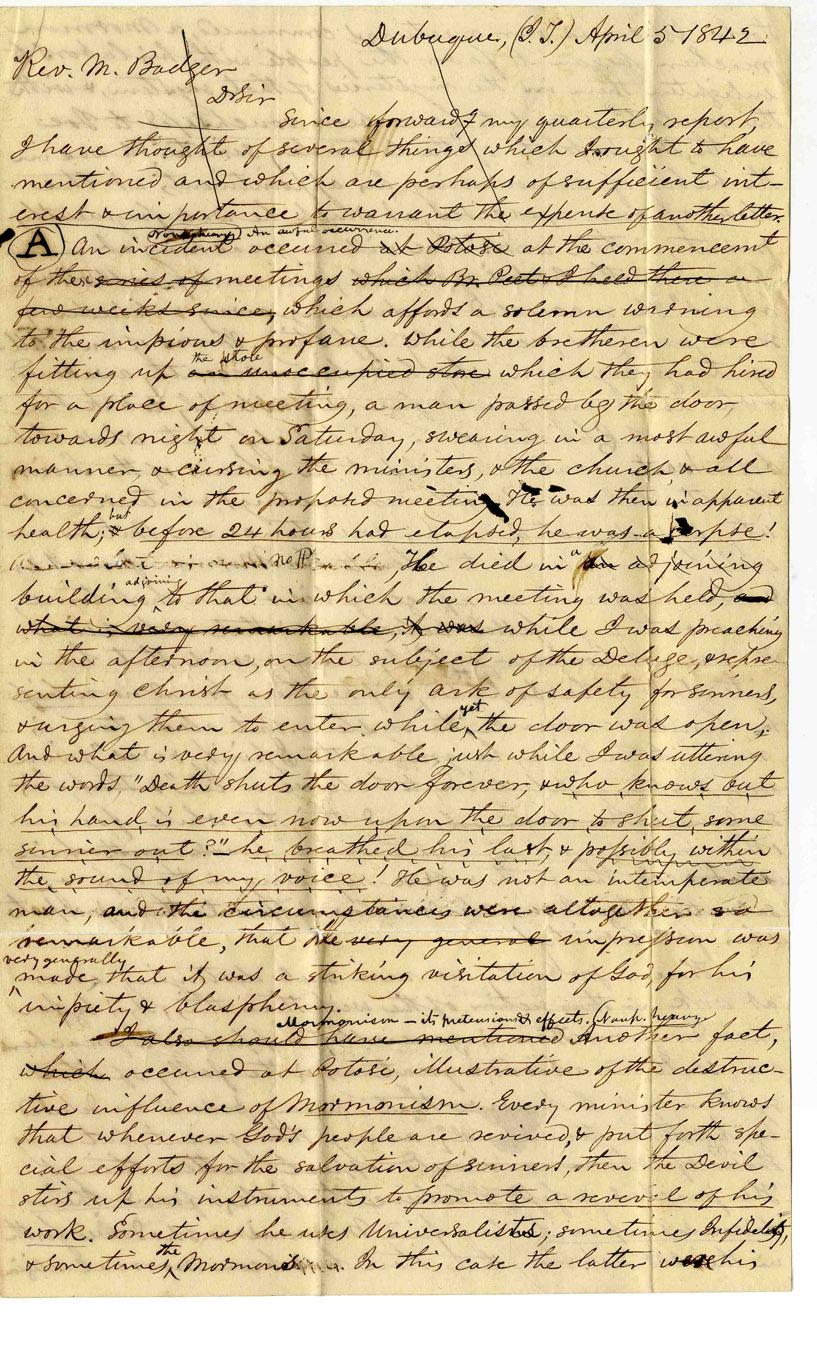Autograph letter signed by a Presbyterian missionary regarding Nauvoo and Mormonism. Composed to Reverend Milton Badger, Secretary of the American Home Missionary Society in New York, by John C. Holbrook. Datelined Dubuque, Iowa Territory, 5 April 1842, Holbrook complains of the destructive influence of Mormonism. “...Every minister knows that whenever God's people are revived, & put forth special efforts for the salvation of sinners, then the Devil stirs up his instruments to promote a revival of his work. Sometimes he uses Universalists; sometimes Infidels, & sometimes the Mormons...” A Mormon had been interrupting the missionary's prayer meetings, addressing the congregation to enlighten them in the mysteries of that system, & with the revelations said to have been vouchsafed to Joe Smith, the prophet of “the latter day Saints.” The man had come to the mission for enlightenment, but it seems that Holbrook's doctrines could not attract him, for he would announce at the close of meetings that “There will be preaching...by one of the Elders of Israel,” commonly called Mormons. Holbrook especially despises the doctrine, “signs shall follow them that believe,” &c., “they shall speak with new tongues - shall lay hands on the sick & they shall recover” & “that these are the evidences of real faith. They profess to perform these miracles.” He goes on to complain in less indignant terms about competition from Catholics. Emendations throughout in ink show that this letter was adapted for use by the Missionary Society in one of its publications. Letter measures 7.5'' x 12.5''. Bottom fourth cleanly detached, with partial splits at other folds. A fascinating letter in fragile, though good condition.