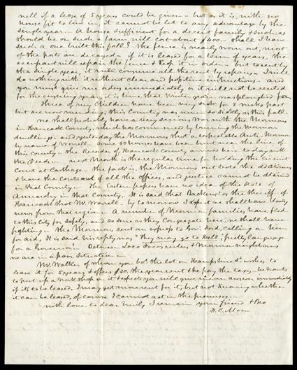 Autograph letter signed by F.C. Moore of Quincy, Illinois reporting a mob war with the Mormons in Nauvoo, Illinois. Dated 17 September 1845, Moore writes to John Pierce in New York. In part: ''...We shall probably have a very serious war with the Mormons in Hancock County, which has commenced by burning the Mormon dwellings, and yesterday the Mormons shot a respectable Anti-Mormon by name of [Franklin] Worrell. Some 50 houses have been burnt near the line of this county...The fact is, the Mormons out vote the old citizens & have the contract of all the offices, and justice cannot be obtained in that county. The Eastern papers have no idea of the state of annarchy in that county. It is said that [Mormon supporter Jacob] Backenstos the Sheriff of Hancock shot Mr. Worrell. By tomorrow I expect we shall have bloody news from that region. A number of Mormon families have fled to this city for safety, and so sure as they congregate here, we shall have fighting. The Mormons sent an express to Gov. [Thomas] Ford, calling on him for aid. It is said his reply was, 'THEY MAY GO TO HELL.,' pretty language for a Governor! Between Loco Foco's rulers & Mormon neighbours we are in a poor situation...'' Jacob Worrell had been captain of the Carthage militia who had guarded Joseph Smith's cell and permitted the mob to storm it. He was most likely killed by one of the most feared Mormon enforcers, Orrin Porter Rockwell. The locofocos were a group of radical Democrats prominent in the 1830's; by 1845 the name was used perjoratively when referring to Democrats in general. It would not be long before the Latter-day Saints in Nauvoo were compelled to move yet again from what had seemed to be their promised land. Fine condition.