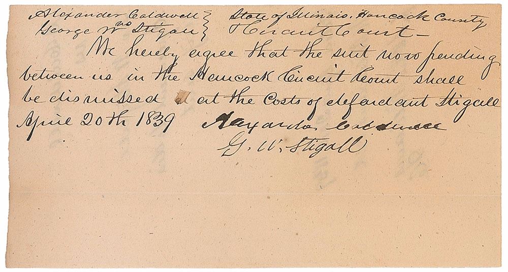 Manuscript DS, signed by Alexander Caldwell and George. W. Stigall, two Carthage officials who failed to protect Joseph and Hyrum Smith during their incarceration in the Carthage Jail, one page, 7 x 4, April 20, 1839. Legal document reads, in full: “We hereby agree that the suit now pending between us in the Hancock Circuit Court shall be dismissed at the Costs of defendant Stigall.” Docketed on the reverse, “A. Caldwell / vs / Geo W Stigall / Agreement to dis / miss suit / Filed April 20th 1839 / W Williams clk / pr S Otho Williams / DC,” all in the handwriting of Deputy Clerk Samuel Otho Williams. In fine condition.