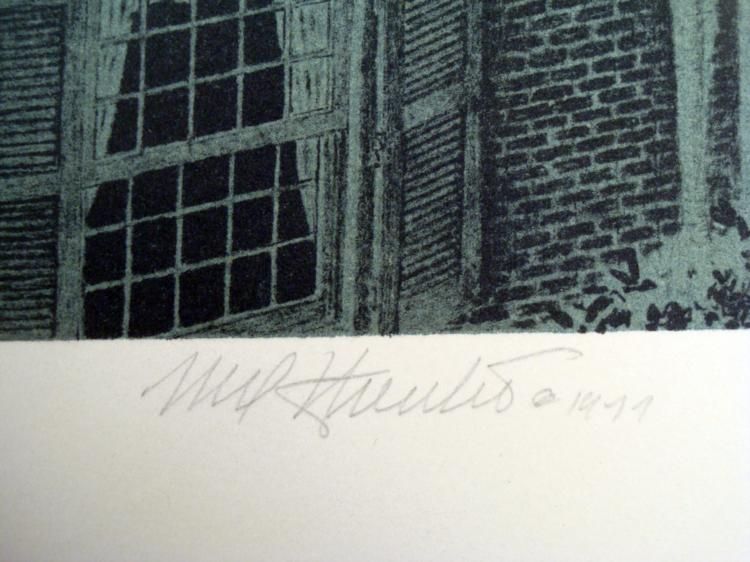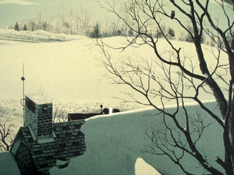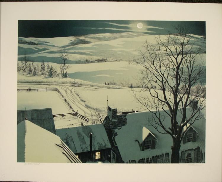 This stunning piece by Mel Hunter portays a quiet snow covered home on a tranquil Sunday morning. Time to do your chores!! * Artist: Mel Hunter Title: Morning Chores Medium: Print on Paper Signature: in white pencil, lower right Dedication: "Michel T" - in white pencil, lower left Size: 24" x 30" Condition: Excellent Biography * Prior to making fine art prints, Hunter illustrated science books while living in New York City. During the summer of 1967, he relocated to southern Vermont, where he established his home and studio in a farmhouse high on a forested hill. At that point, he began depicting the land, animals, birds and changing seasons of his rural, semi-wild environment. *
