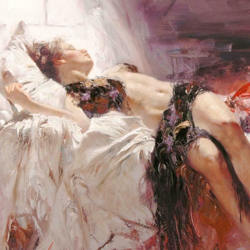 Morning Dreams by Pino (1939-2010). "Morning Dreams" is an artist embellished limited edition giclee on canvas by Pino (1939-2010), CP Numbered and hand signed by the artist. Includes Certificate of Authenticity. Measures approx. 30" x 26" (image). This piece is not stretched.
