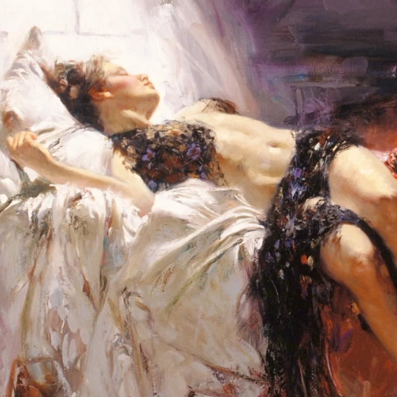 "Morning Dreams" is a limited edition giclee on canvas, numbered and hand signed by Pino (1939-2010). Includes Certificate of Authenticity! Measures approx. 14" x 12" (image).