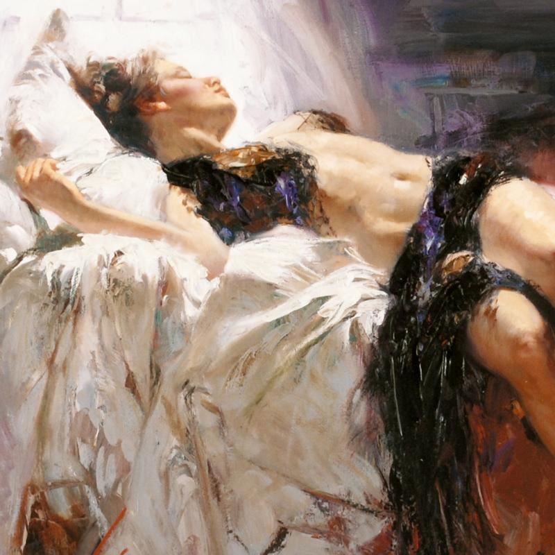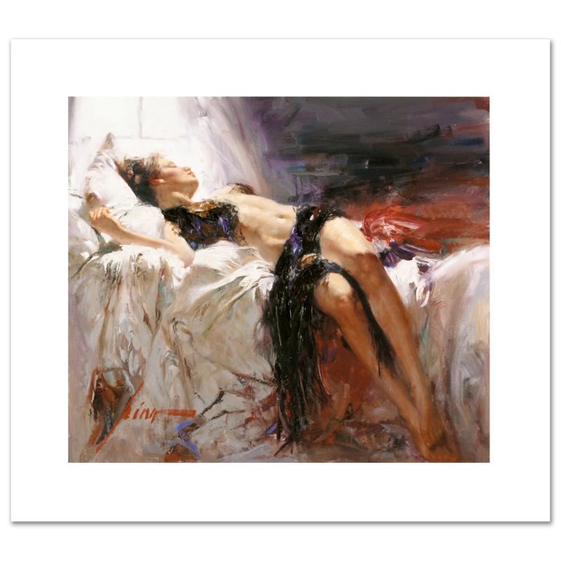 Pino's portraits allow glimpses into intensely personal, intimate spaces, conveying emotion through rich, warm color and sensual brushwork. "Morning Dreams" is a limited edition giclee on canvas that has been hand-embellished by Pino himself, AP numbered and hand signed by Pino (1939-2010). Includes Certificate of Authenticity! Measures approx. 14" x 12" (image).