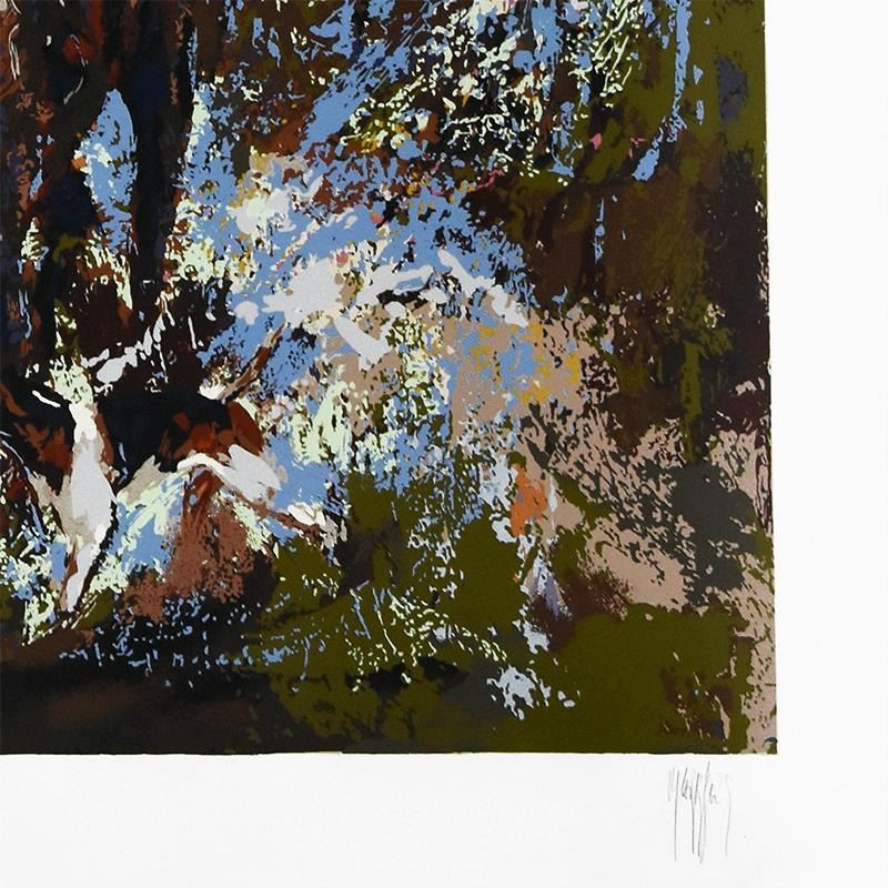 "Morning Hunt" is a limited edition serigraph on paper by Mark King (1931-2014), numbered and hand signed by the artist. Includes Letter of Authenticity. Measures approx. 44.5" x 36" (border), 40" x 30" (image). ** Please note: due to the age of this piece there are creases in the white border area. **