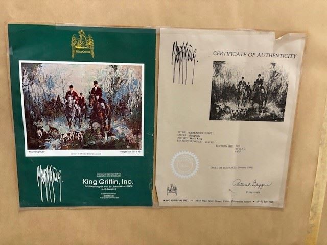 A framed serigraph by the late great Mark King, feasturing a Fox Hunt through the woods. #104/325. Frame is old but good 50.5x41"