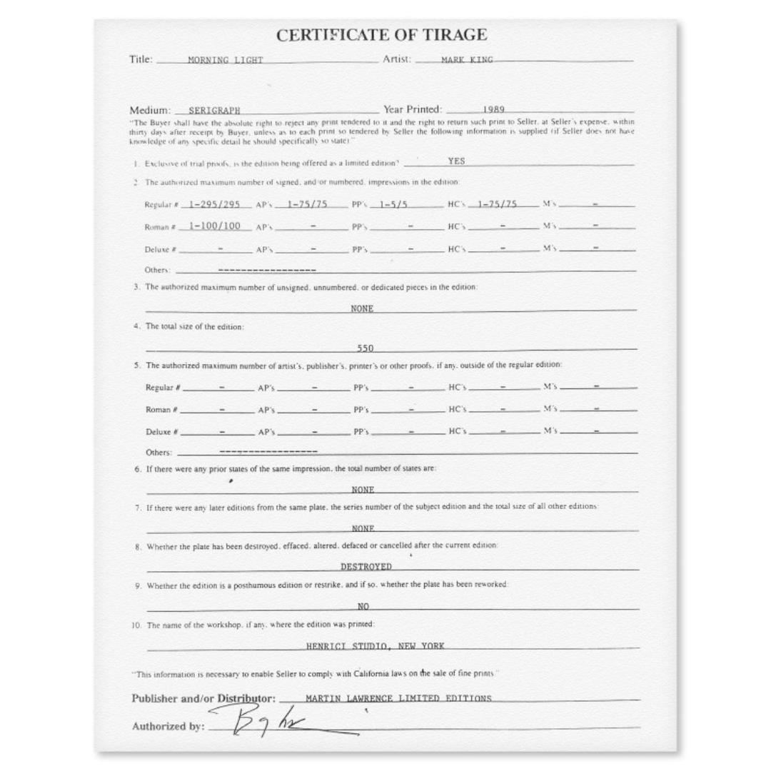"Morning Light" is a limited edition serigraph on paper by Mark King (1931-2014). Hand signed and numbered, this piece comes with a letter of authenticity and measures approximately 30" x 40" (image).
