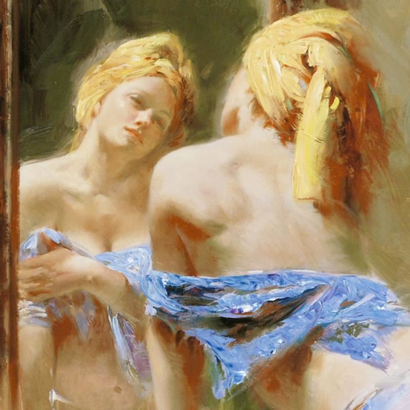 Pino's portraits allow glimpses into intensely personal, intimate spaces, conveying emotion through rich, warm color and sensual brushwork. "Morning Reflections" is a limited edition giclee on canvas that has been hand-embellished by Pino himself, AP numbered and hand signed by Pino (1939-2010). Includes Certificate of Authenticity! Measures approx. 16" x 18" (image).