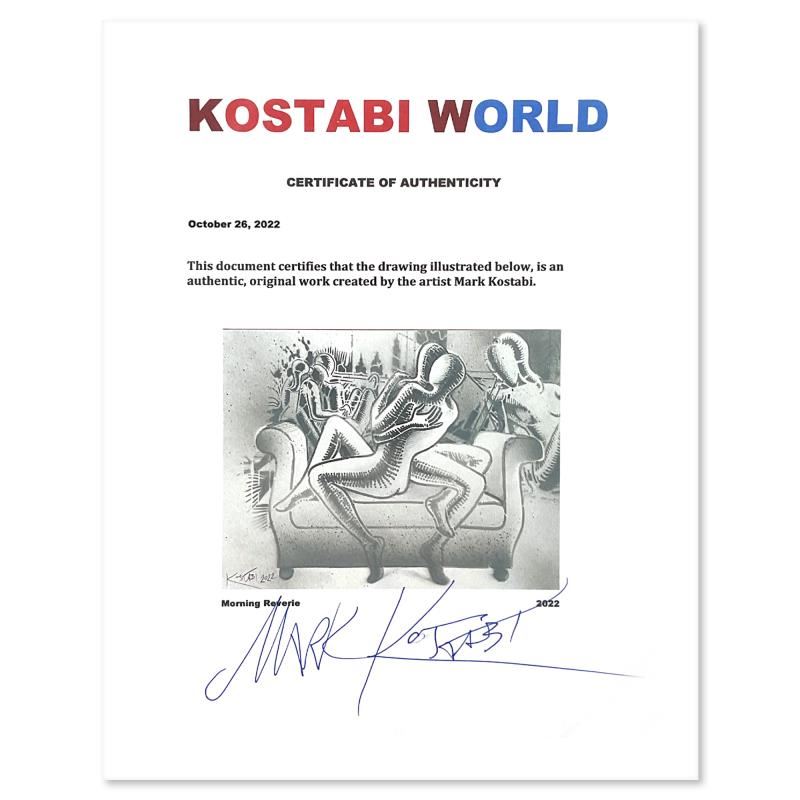 "Morning Reverie" is an original drawing on paper by Mark Kostabi, dated 2022 and hand signed by the artist. This piece comes custom framed. Includes Certificate of Authenticity. Measures approx. 19" x 15" (frame), 14" x 10" (image).