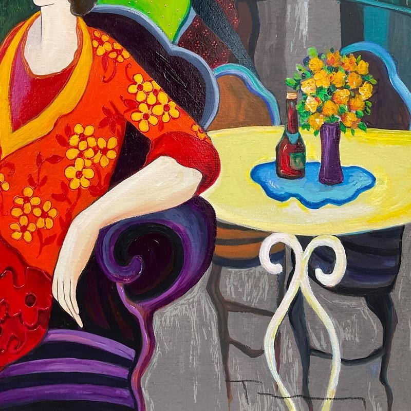 "Morning Tea" is a one-of-a-kind mixed media over paint on canvas by Itzchak Tarkay (1935-2012), hand signed by the artist. Includes Letter of Authenticity. Measures approx. 28.5" x 23" (image).
