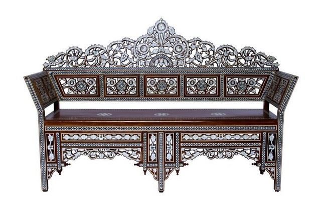 Moroccan Inlaid Love Seat - Authentic, inlaid pieces were created to coordinate with exotic themes to provide a one-of-a-kind experience. Rich, Moroccan, Exotic, Lush. Dimensions: 4'7'' W x 1'6'' D x 3' H. Rental price associated with this item $488.75.