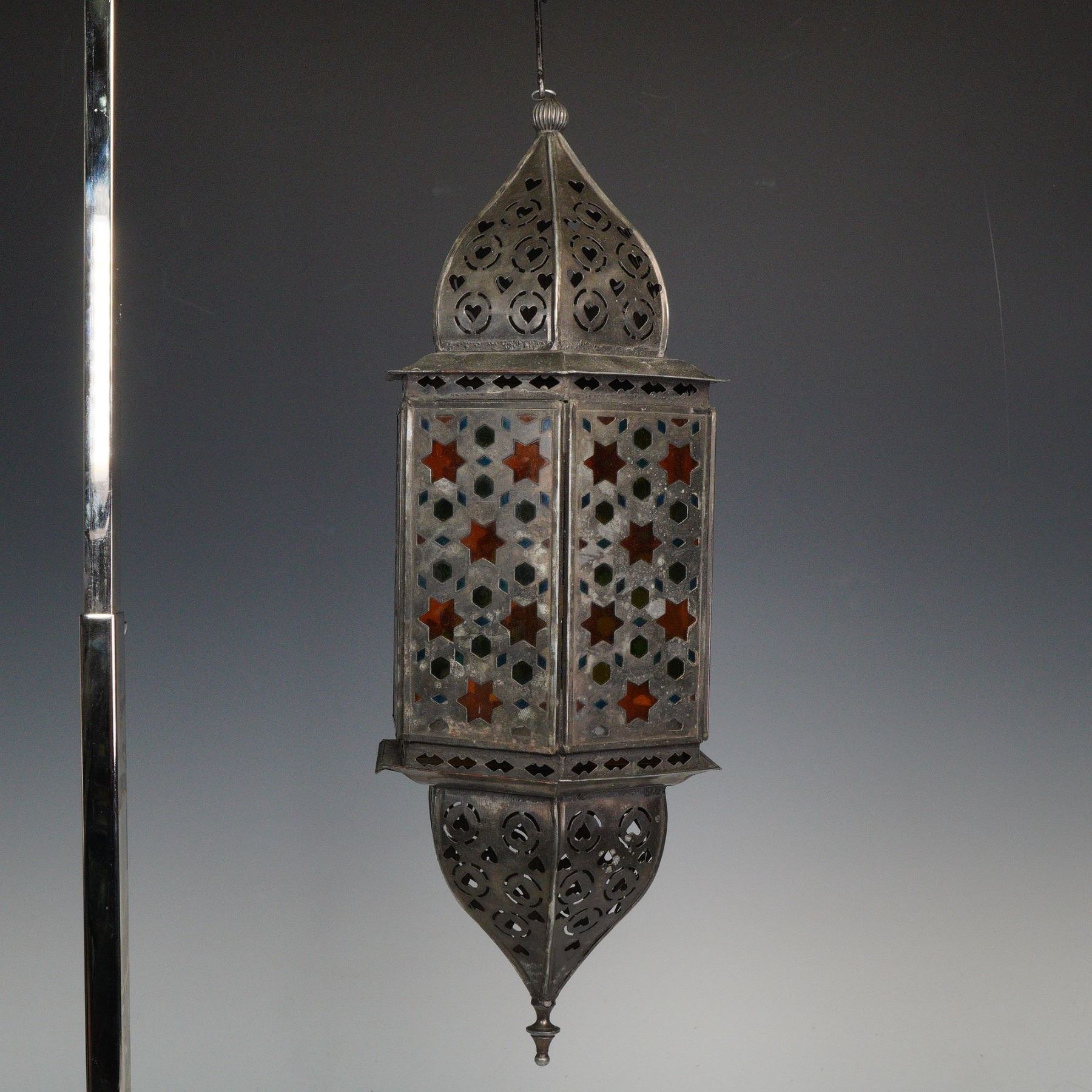 Moroccan Metal and Glass Arabesque Metalwork Hanging Lantern