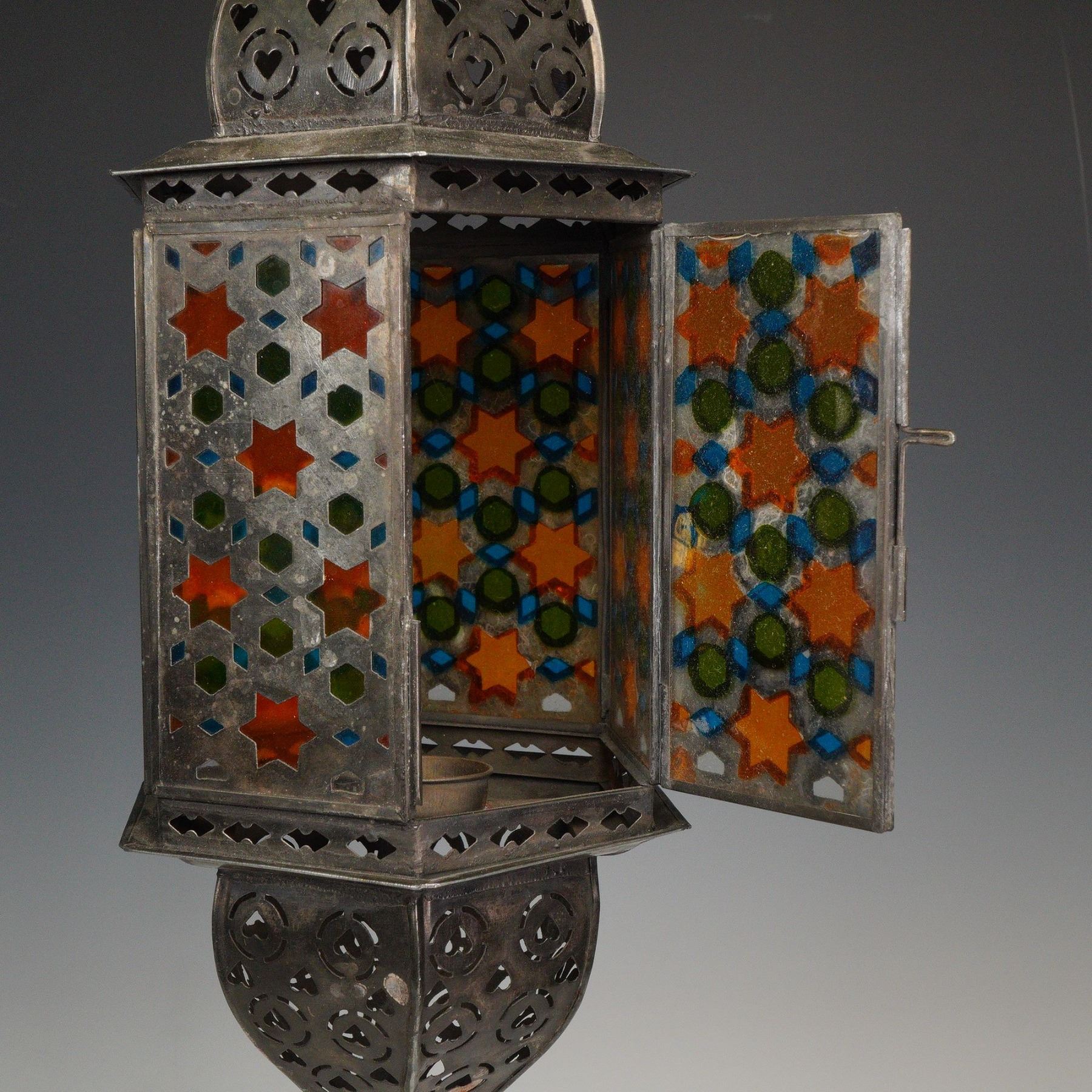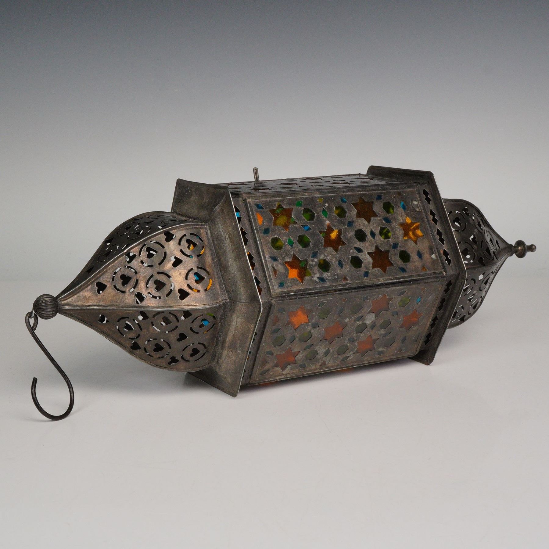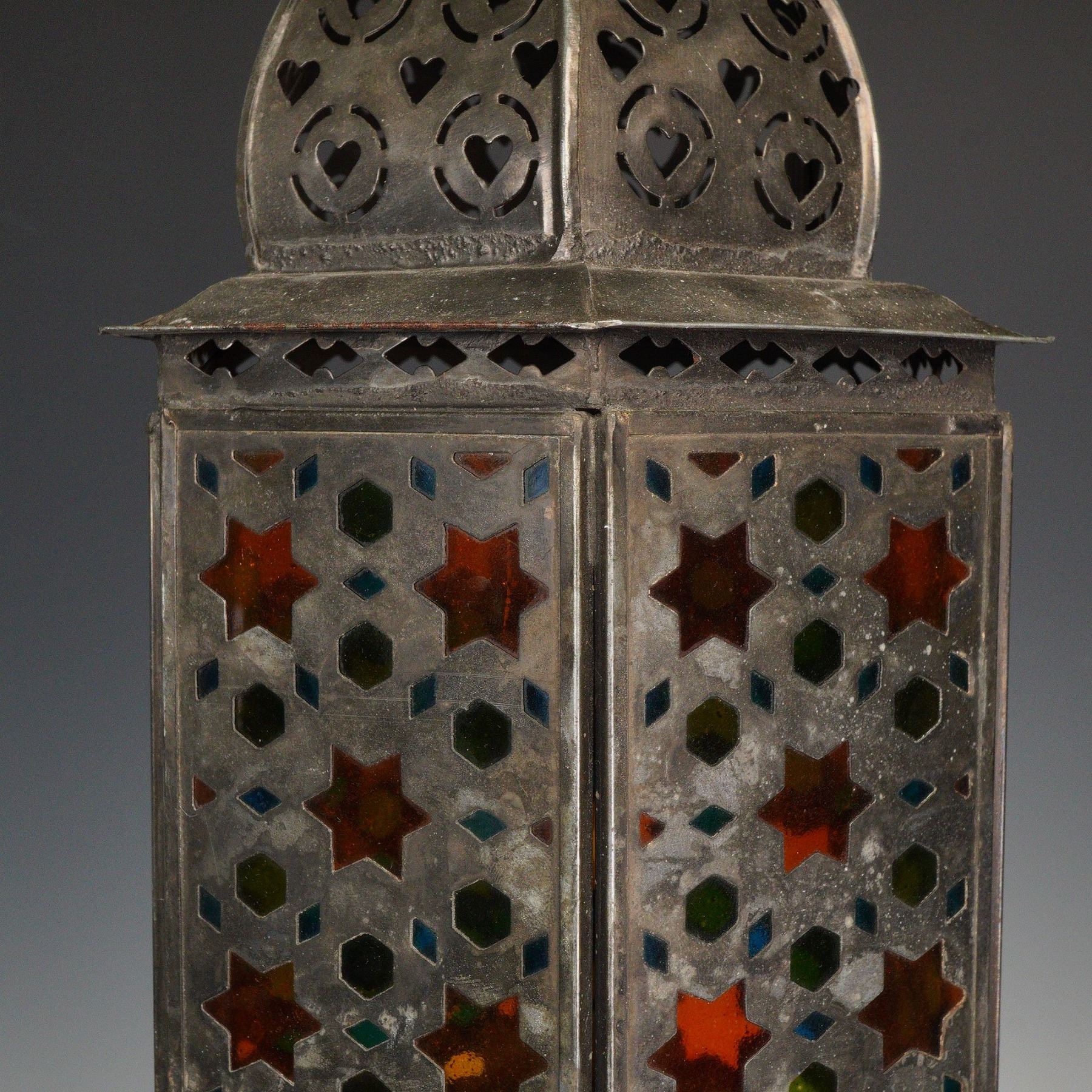 Moroccan metal and glass hanging lantern, having domed octagonal finials at top and bottom, over conforming body, with multicolor glass panes, with Arabesque metalwork.