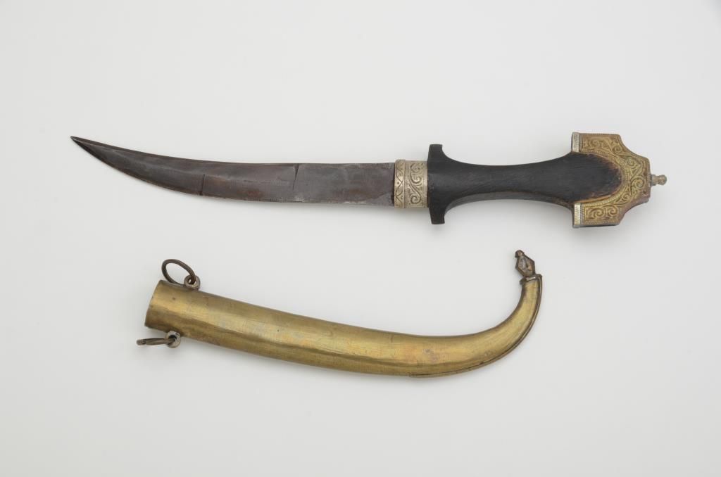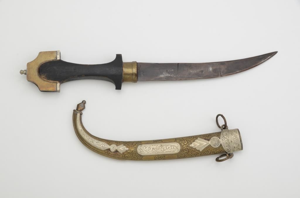 Moroccan curved blade ceremonial knife with engraved metal scabbard, approx. 15” overall with wood grip and engraved pommel; overall fair to good condition. Est.: $50-$100.
