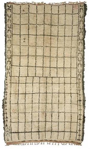 Moroccan<BR>rug<BR>c. 1920<BR>hand-knotted wool<BR>76"w x 128"d<BR>Moroccan rugs of this period resemble modern art compositions, often having unique irregularities in the pattern and color.<BR><BR><BR><BR><BR><BR>