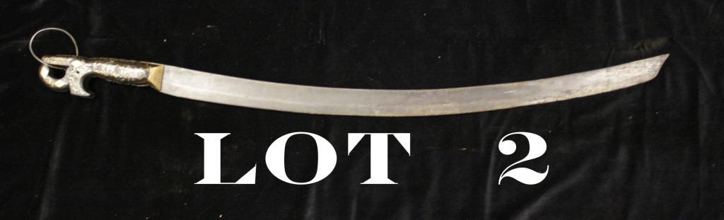 Moroccan style curved blade saber (no sheath) with brass inlaid wood grip in overall fair, untouched condition. A great decorator. Est.: $20-$40.