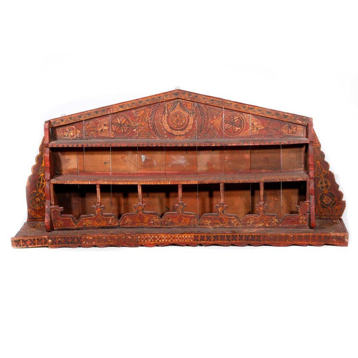 c. 20th century, carved and polychromed in traditional fashion, shelf measuring 22 inches high x 50 wide x 8 1/2 deep.