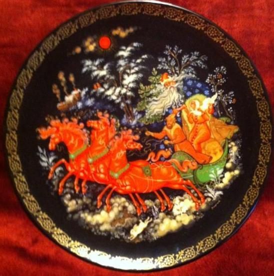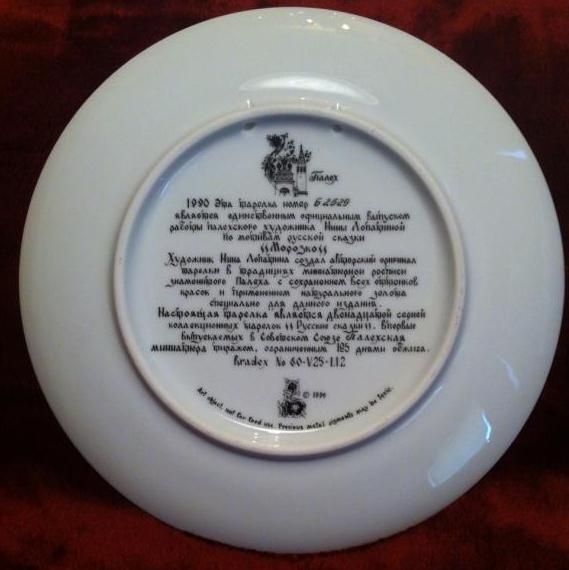 Backstamp 1990 Palekh Arts Studios This plate is number b2529 in the only authorized edition of "Morozko" by Nina P. Lopatina. Inspired by a tale from the Ural Mountains. Twelve issue in the Russian Legends collection, the first collector's plate series ever produced in Russia. "Morozko" was created from a true Palekh lacquer original painted in extreme detail solely for this edition by Master Artist Nina P.Lopatina. This plate is produced in layers of pigment and gold in an edition limited to a maximum of 195 firing days. Bradex No. 60-V25-1.12 Certificate of Authenticity included All documentation is included in the original package box which has age stains.