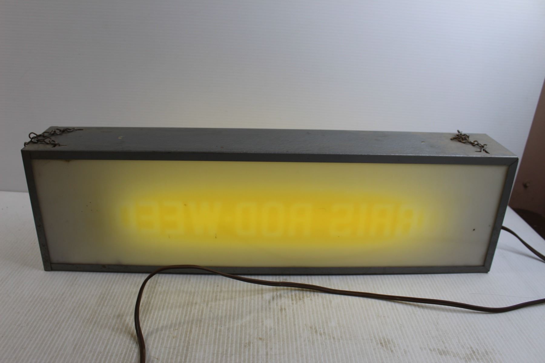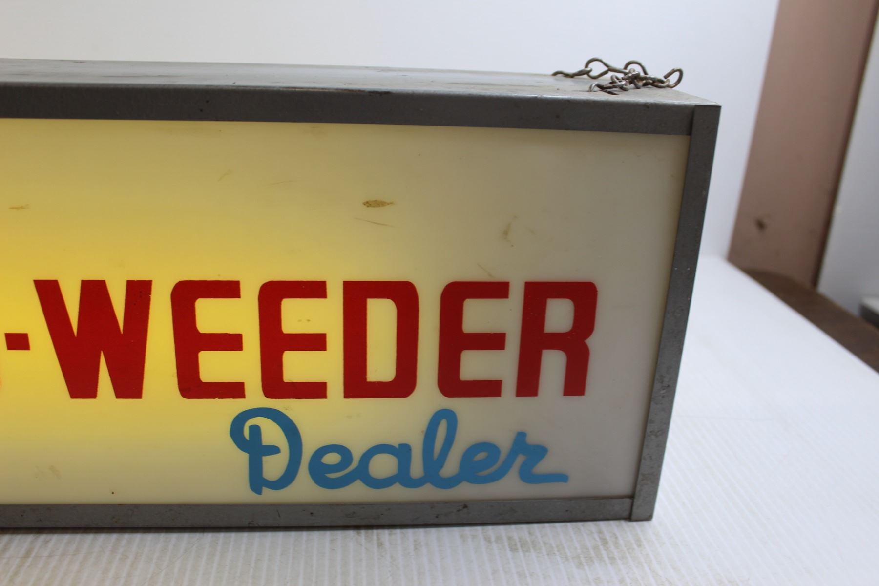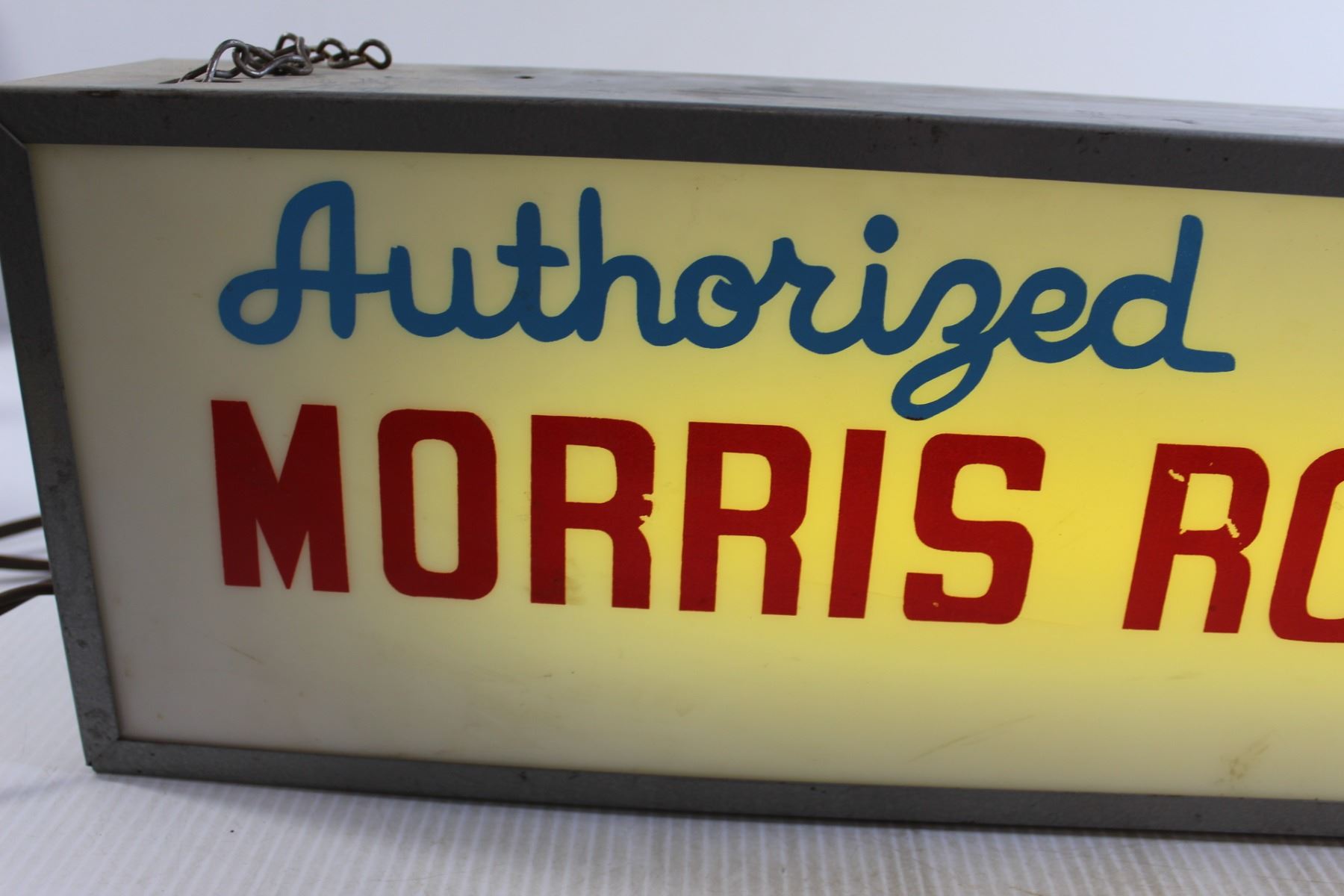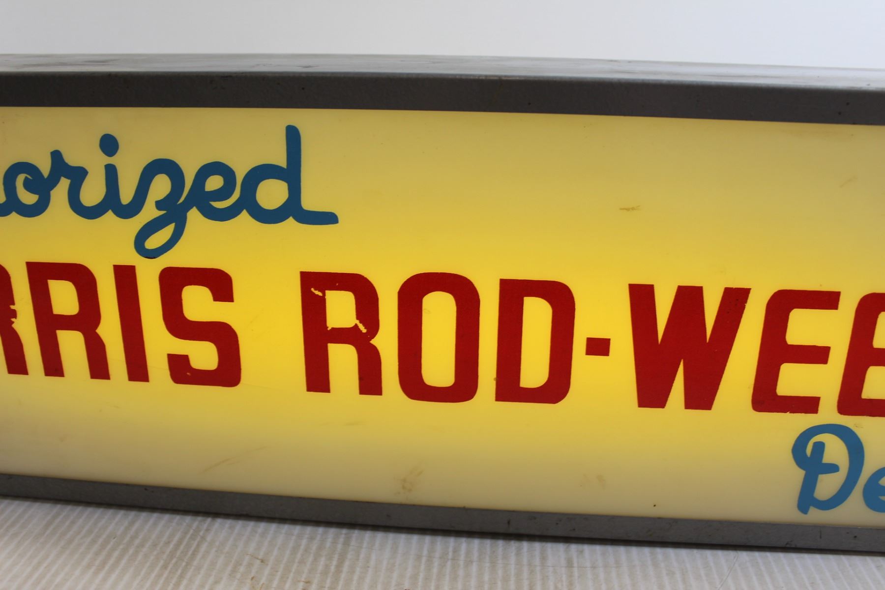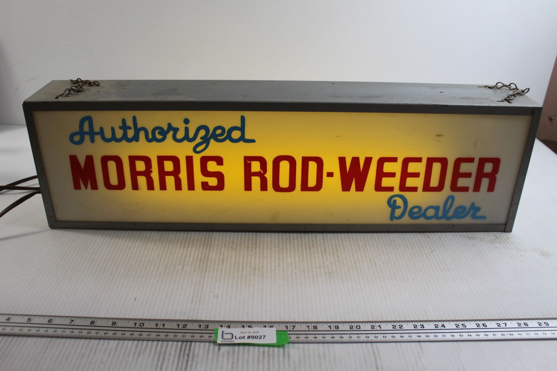 Morris 1960s Rod-Weeder Dealer Sign - 28" x 8" x 4 1/2", Works