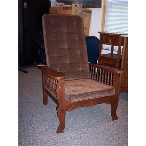 Great old Morris Chair. Refinished in a dark brown oak color. Nice carving details on front legs and turned spindles below arms. Has a replacent sold brass adjustment rod for back support. Brand new cushions in brown velour. Nice chair for the money.