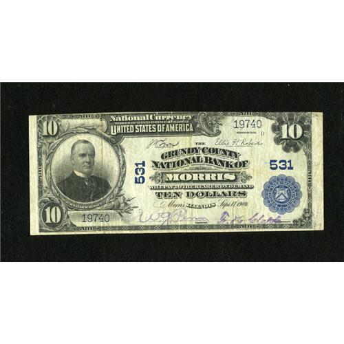 <B>Morris, IL</B></I> - $10 1902 Plain Back Fr. 624 <B>The Grundy County NB</B></I> Ch. # 531<BR>Stamped signatures of the president and cashier remain bold. The paper is solid, with the exception of a partially punched circle from a hold puncher. <B>Fine-Very Fine.</B></I><BR><I>From The Lincoln Collection</B></I><BR><BR><b>Shipping:</b> Coins & Currency (<a target="_blank" href="http://www.heritageauctions.com/common/shipping.php">view shipping information</a>)