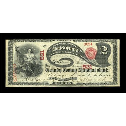 <B>Morris, IL</B></I> - $2 Original Fr. 387 <B>The Grundy County NB</B></I> Ch. # 531<BR> A bright and attractive Lazy Deuce from a high grade group of five that exist within a ten serial number range. They are the only deuces extant from this bank, and most have long been ensconced in collections. This colorful example has the color, flash and embossing of a note printed this morning, but has picked up a few folds along the way. <B>Extremely Fine, </B></I>with the top margin trimmed just a hair close. <BR><I>From The Thomas M. Flynn Collection</B></I><BR><BR><b>Shipping:</b> Coins & Currency (<a target="_blank" href="http://www.heritageauctions.com/common/shipping.php">view shipping information</a>)