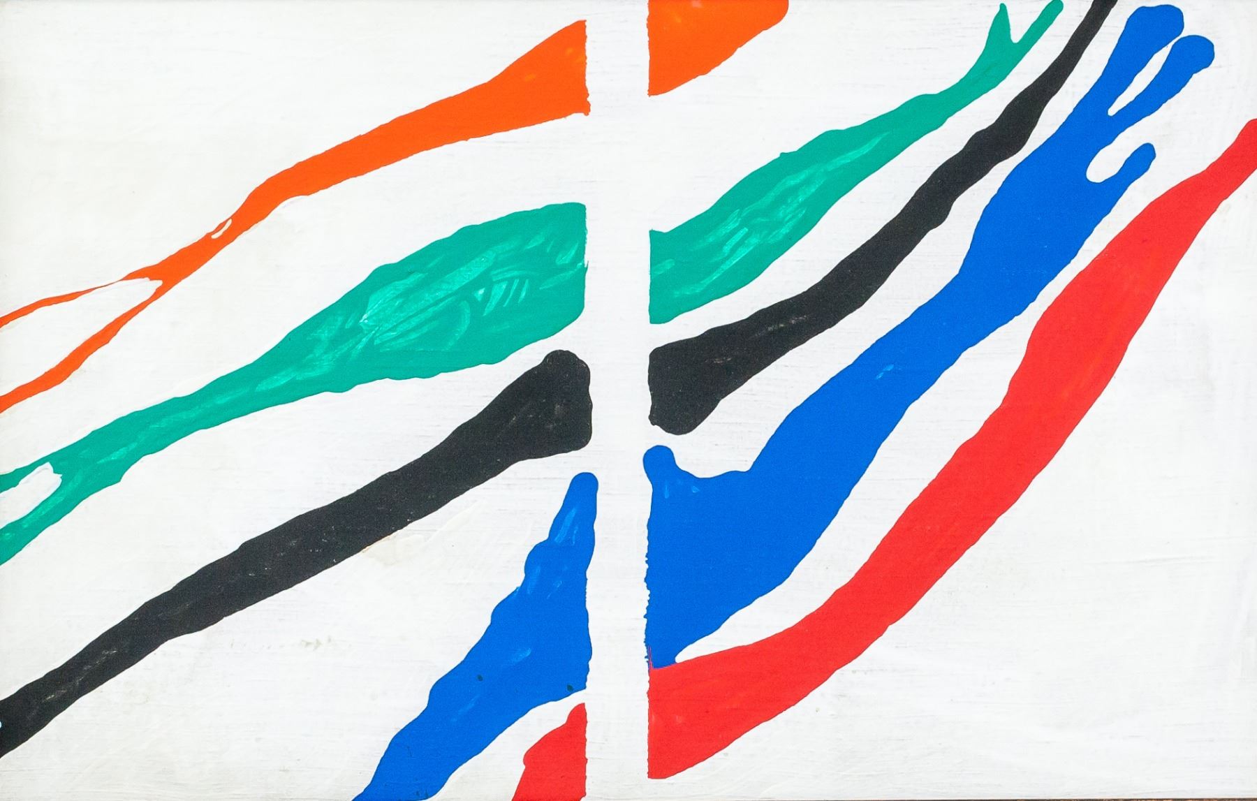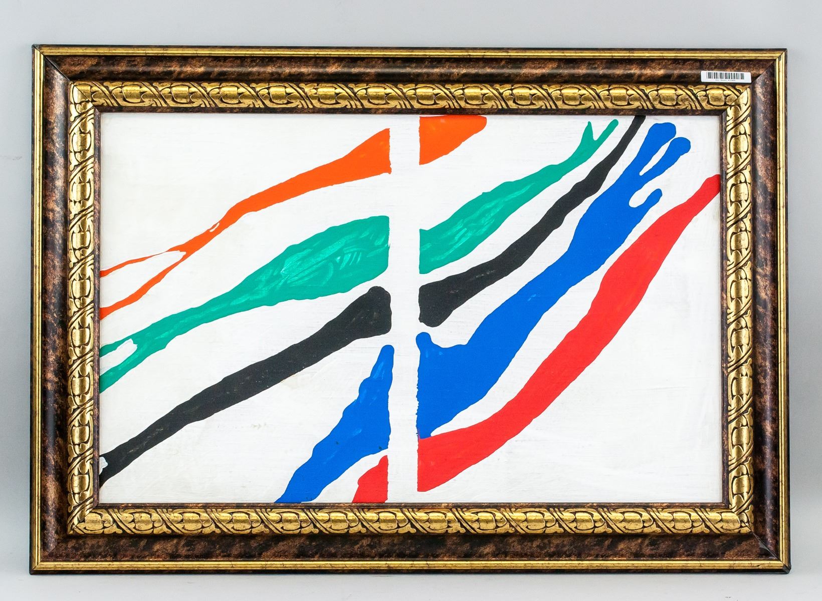 Oil on canvas, framed. Featuring an abstract expressionist composition. Signed on verso M. Louis. Attributed to Morris Louis (1912-1962, American). 35 x 56 cm (14 x 22 inches). Framed size: 47 x 68 cm (18.5 x 26.5 inches). PROVENANCE: Southern Ontario estate