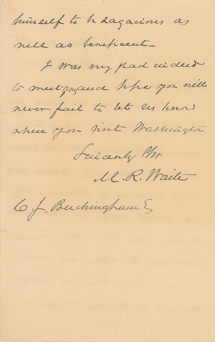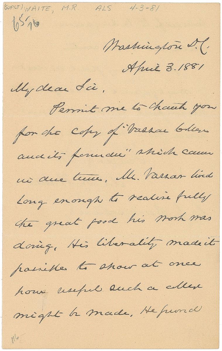 ALS signed “M. R. Waite,” one page both sides, 5 x 8, April 3, 1881. Letter to C. J. Buckingham, written while serving as chief justice. In part: “Permit me to thank you for the copy of ‘Vassar College and its founder’…Mr. Vassar lived long enough to realize fully the great good his work was doing. His liberality made it possible to show at once how useful such a college might be made.” In fine condition. Provenance: The Everett Fisher Collection.