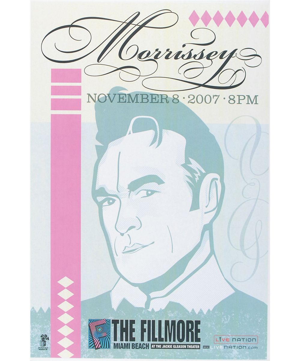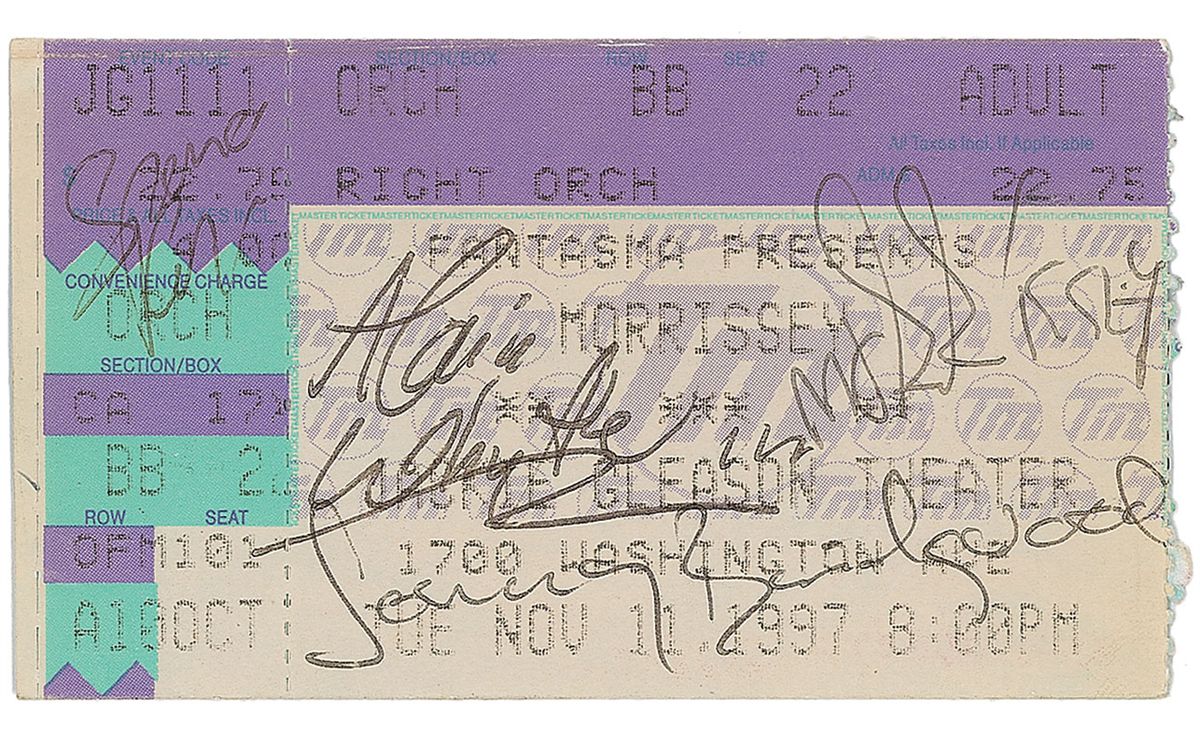 Ticket stub from his performance at the Jackie Gleason Theatre on November 11, 1997, signed on the front in black ballpoint by Morrissey, and also signed by band members Alan Whyte and Jonny Bridgwood. In fine condition. Accompanied by an unsigned color 12 x 18 poster for his 2007 show at the Fillmore in Miami Beach.