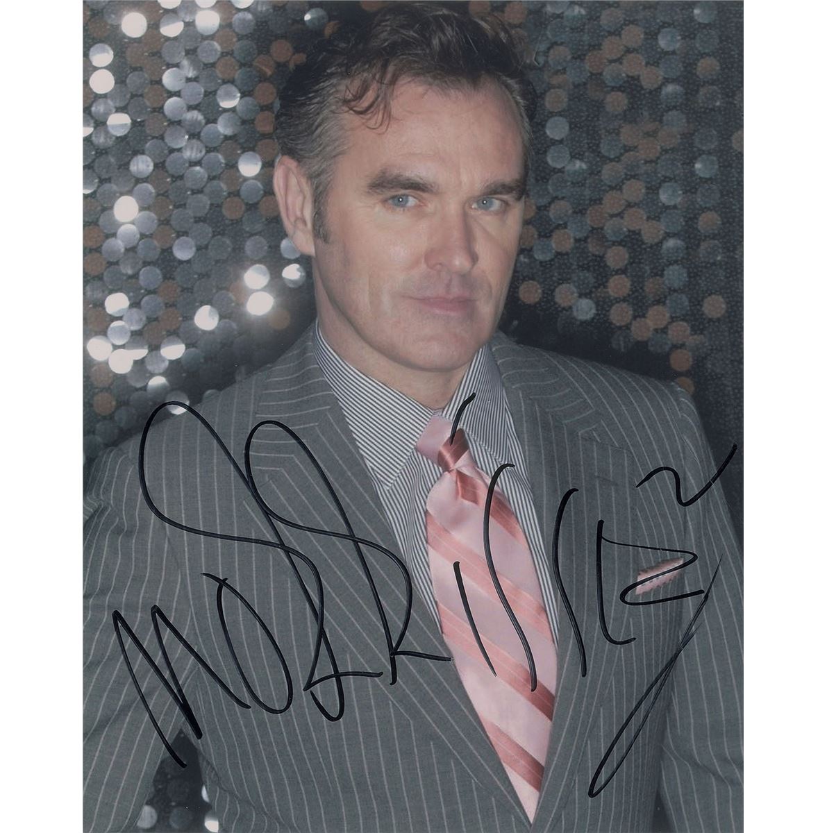 Dapper color glossy 8 x 10 photo of Morrissey in a pinstripe suit, signed in black felt tip. In very fine condition.