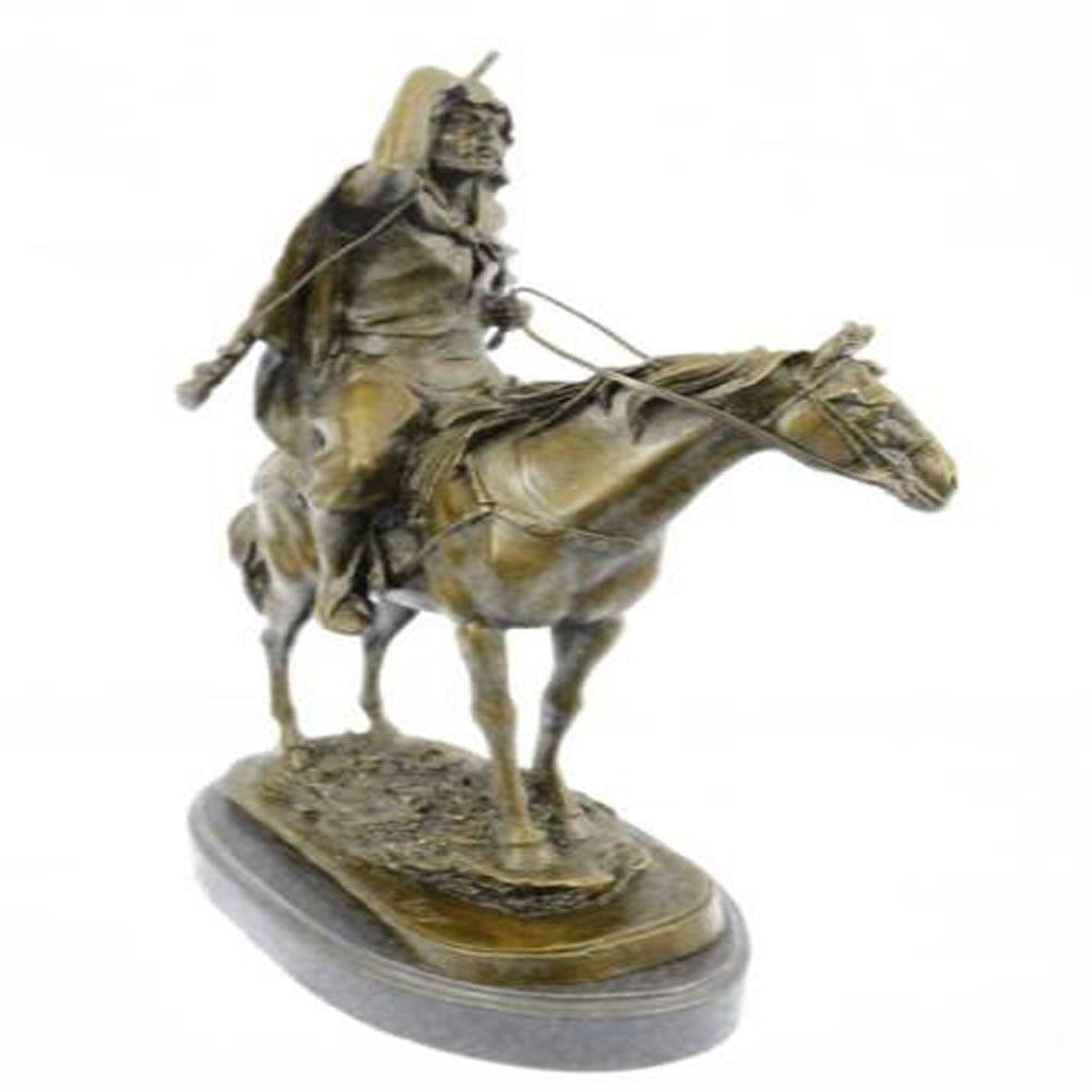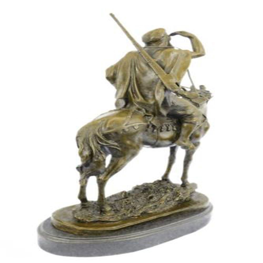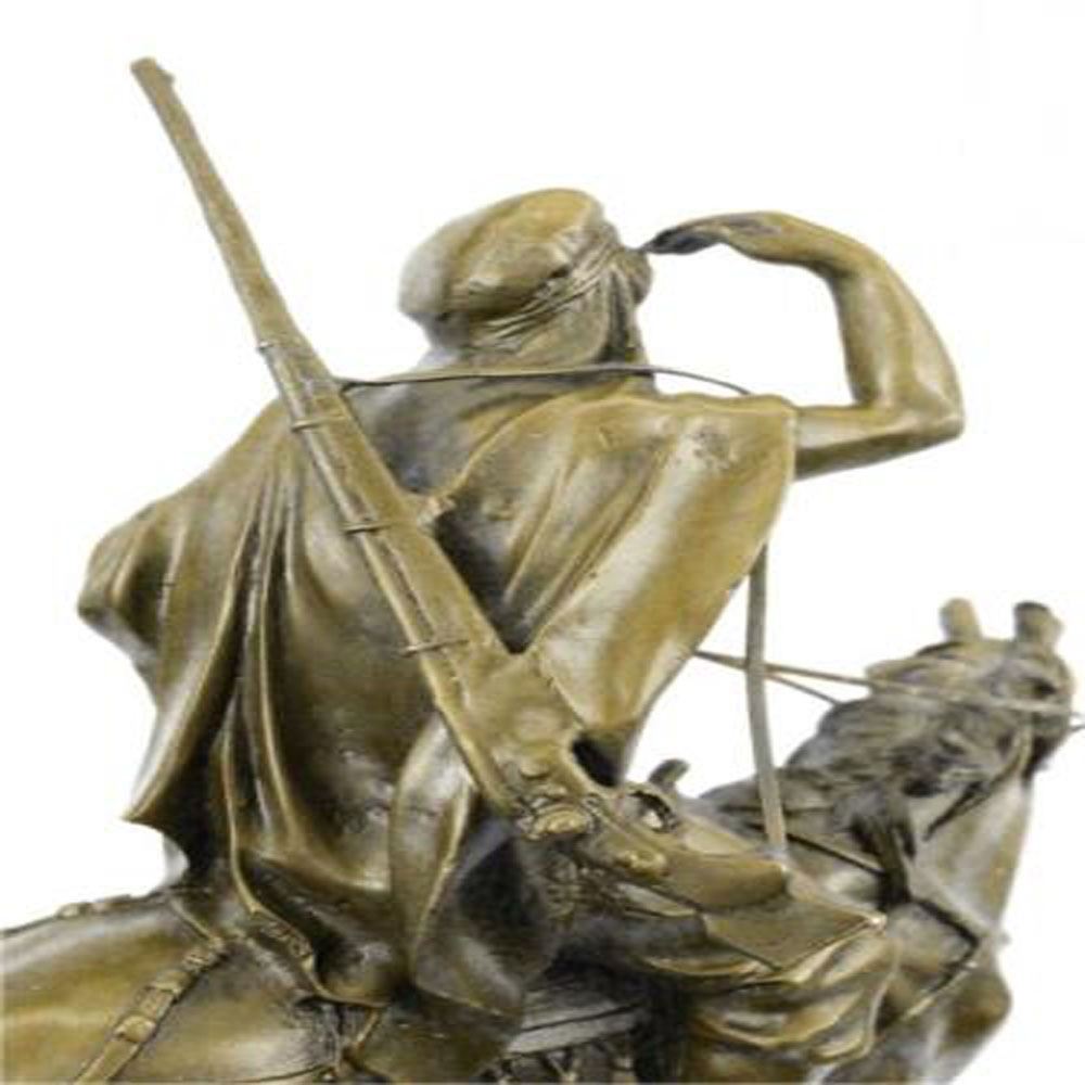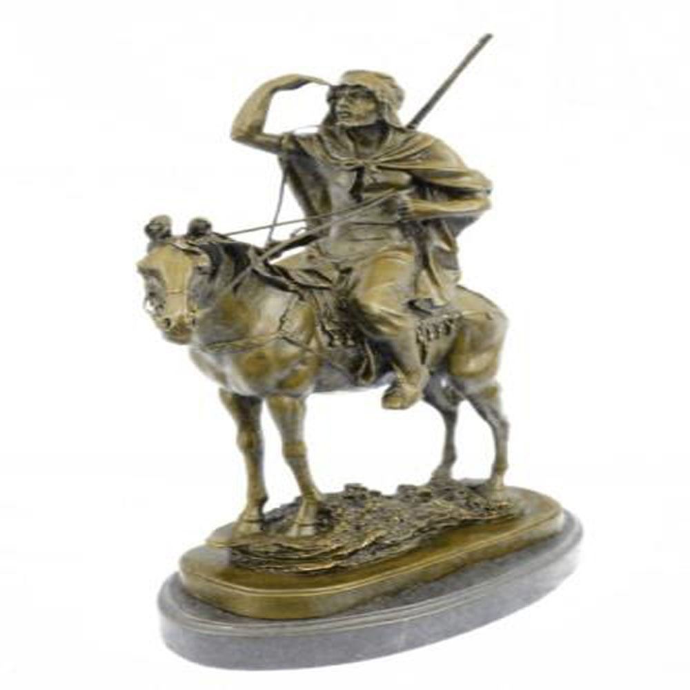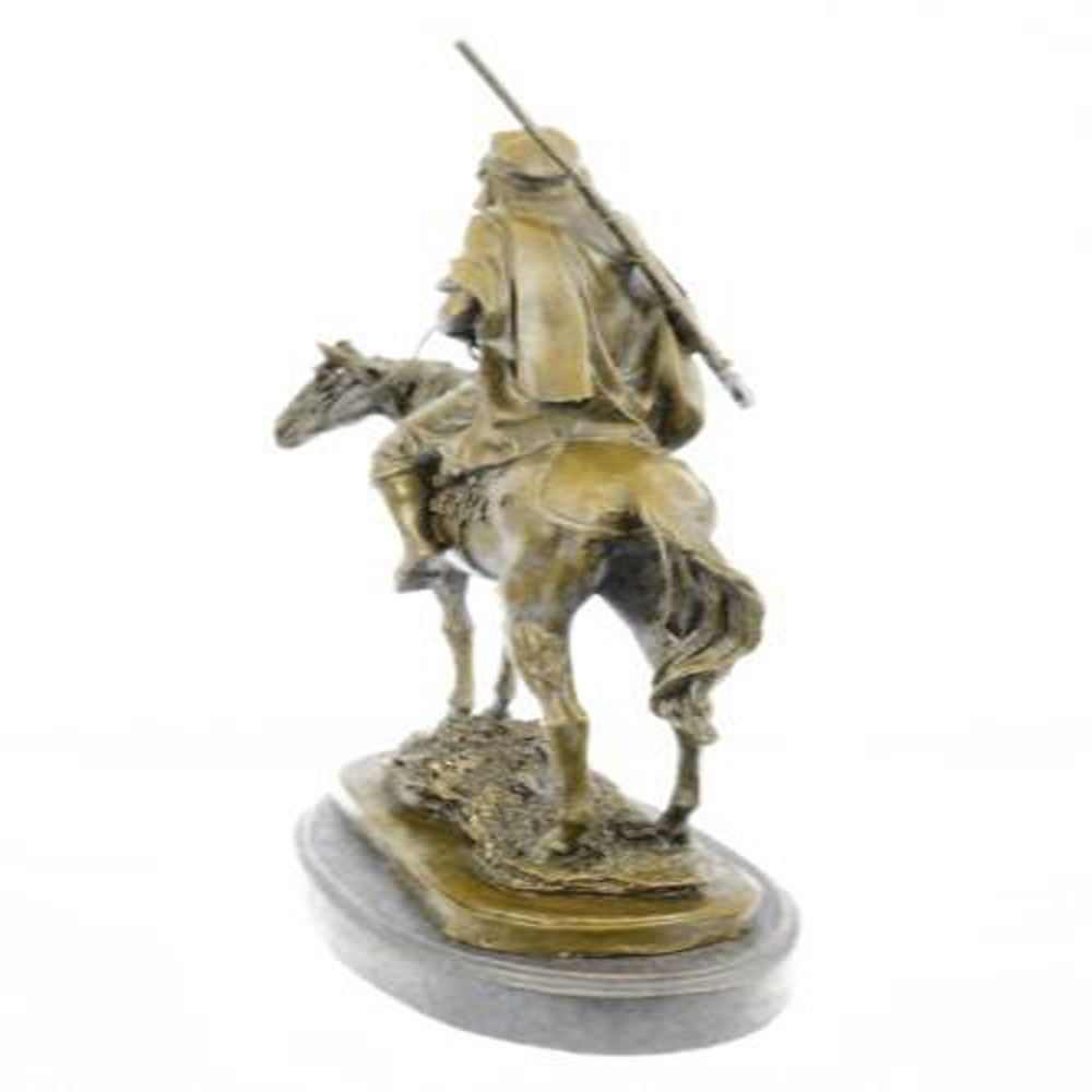 This Sculpture features a man in traditional Arabian garb riding a horse through the desert searching for an oasis. He holds his hand up to shield the torturous sun as his eyes loose and find something in a mirage on the horizon. The handmade Bronze Sculpture was cast using the early method of lost wax casting and stained with a brown patina finish for conservation and is mounted upon a marble base. Bronze Dimensions with Marble Base: Height 16 X Width 11 inches. Weight: 15 LBS.