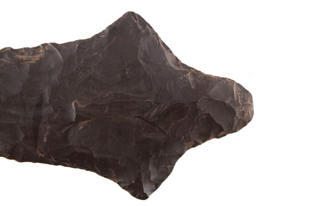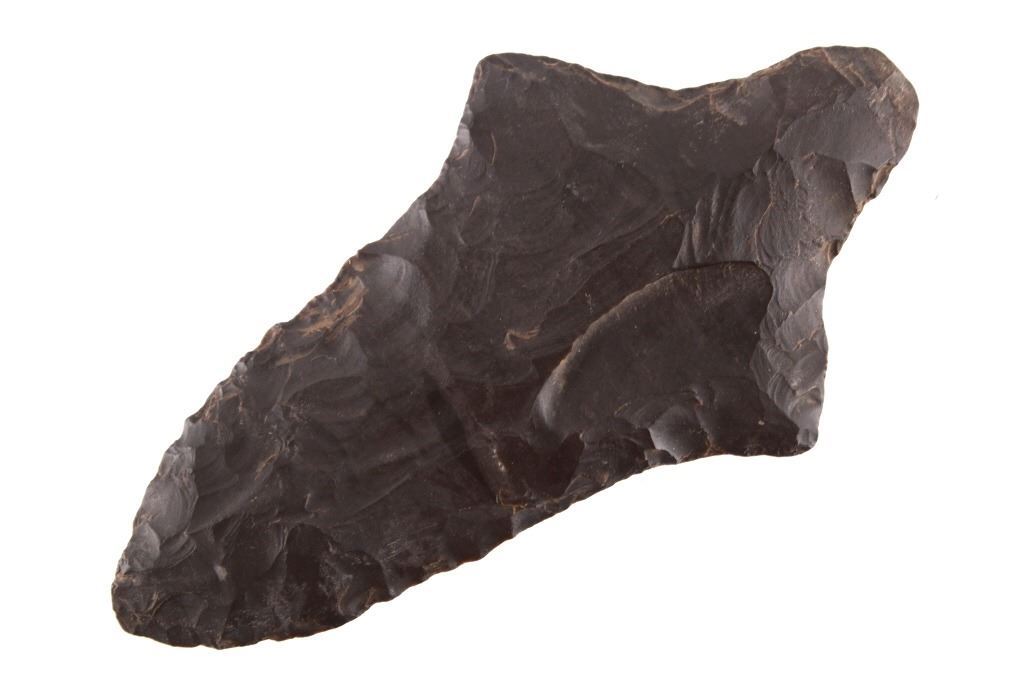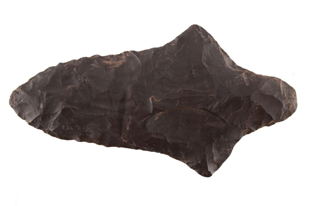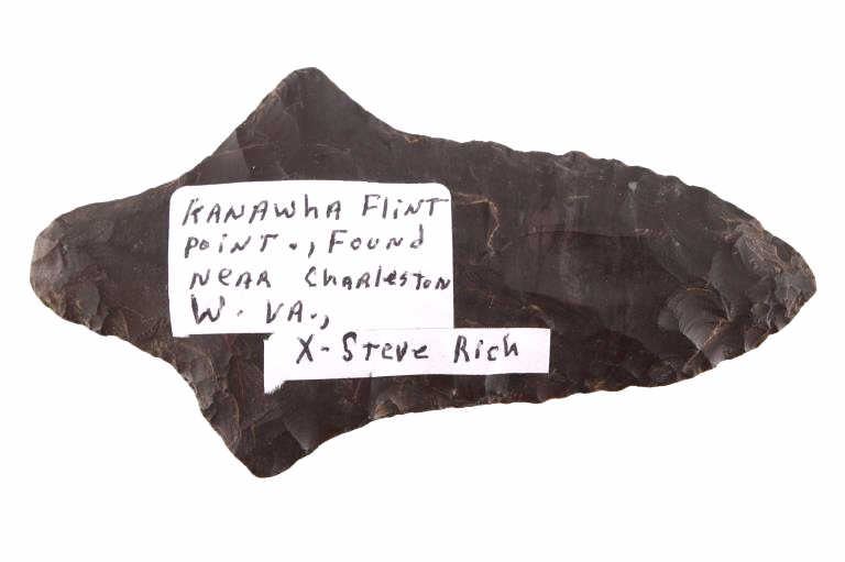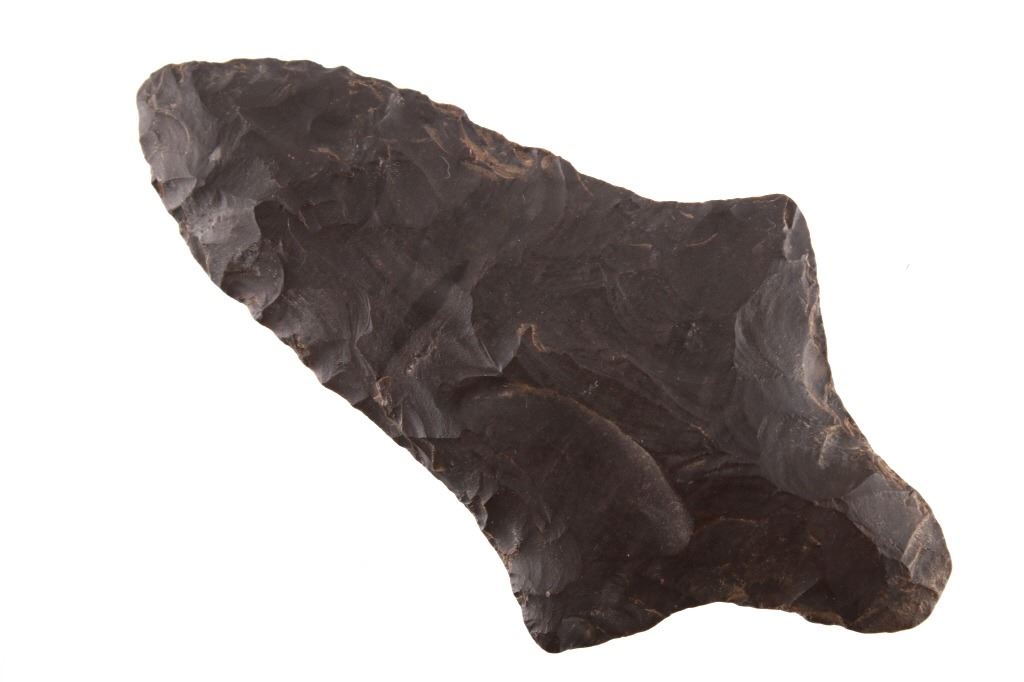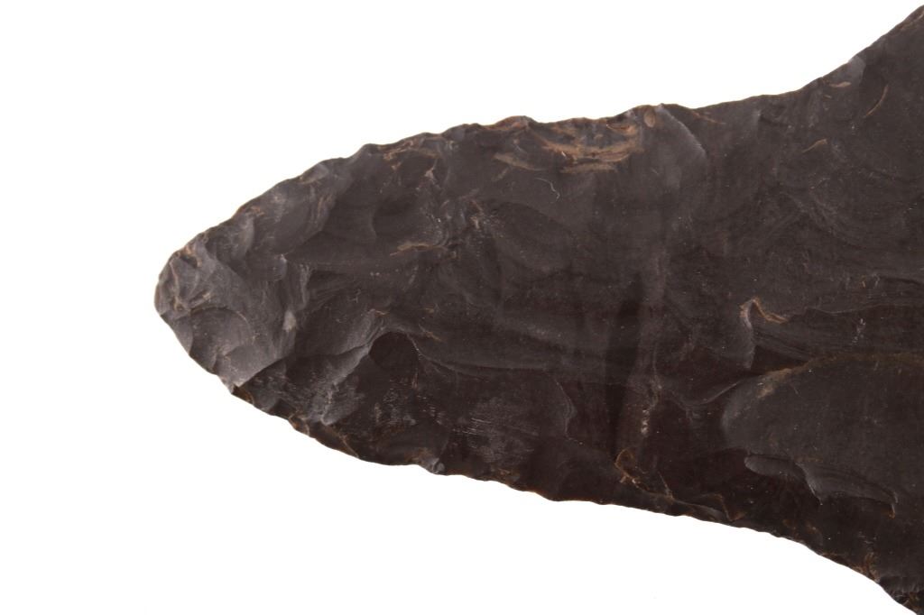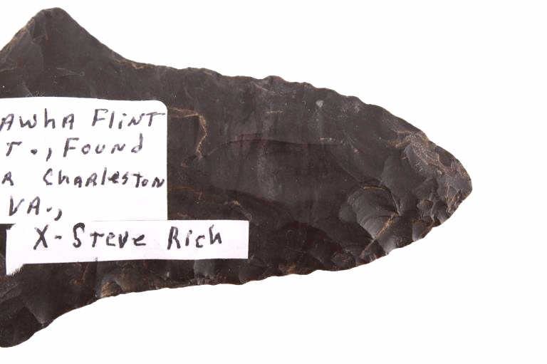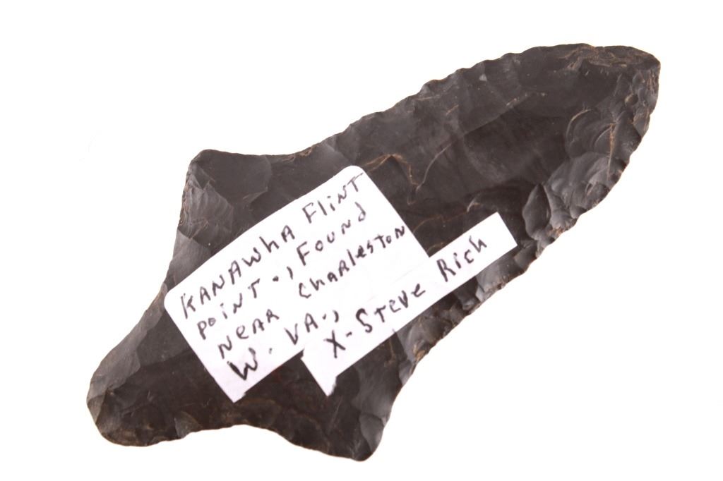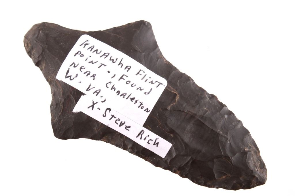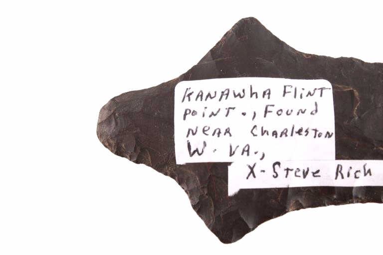 Featured in this lot is this Morrow Mountain Type II point and is dated from Middle Archaic and circa 6,800 - 6,000 B.P. The point features a medium triangular point with a contracting stem with a elliptical cross section. The blade is excurvate and shows a long blade with a semi serrated edge and shows shoulders that are brought out to a point and shows a stem that is elongated and contracting to a pointed base. This point was taken in near Charleston, West Virginia and is knapped form Kanawha flint. The condition of this point is good with no obvious signs of damage and in good overall condition. The measurements of this point are 4 1/8" x 2 1/4" x 3/8"