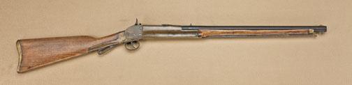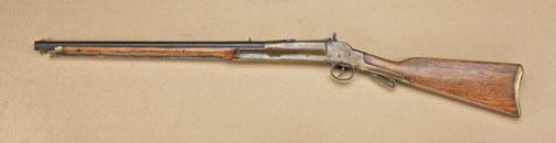 Morse brass-frame single-shot carbine, manufactured by Confederate State Military Works, Greenville SC, made on machinery captured from Harper’s Ferry armory. Approx. .50 caliber centerfire, 20” round barrel, serial #683 on bottom of frame in front of trigger guard. The carbine shows old brazed repairs and a period restocking in a light colored wood. The barrel shows a deep brown patina finish with some scattered light to moderate erosion and pinprick pitting. The frame shows a deep brown patina that matches the barrel well. The stocks are good with some aging, carry, and wear. An original ramrod which screws into matching head in butt is included. There is a screw missing that attaches the bolt to the frame which is easily replaced. The bolt mechanism is serial numbered 683 to match. The bore is very good. The rear sight is original, the front sight is an old period replacement in the original base. Third type. Refer Flayderman 10-044. Only approx. 1,000 were made and estimates of less than 200 extant. Est: $5,000 - $10,000